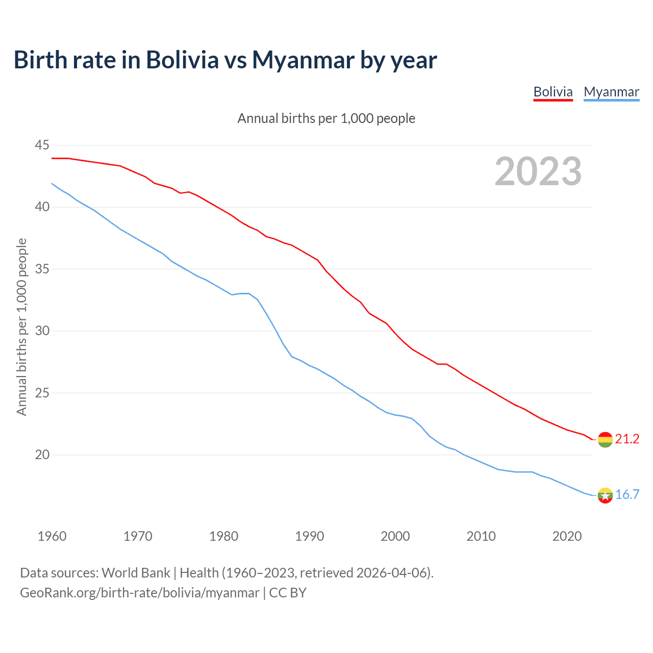 Bolivia has an annual birth rate of 21.2 births per 1,000 people, compared to 16.7 for Myanmar. The average number of children a woman is expected to have during her lifetime — the fertility rate, is 2.55 in Bolivia and 2.12 in Myanmar — 17% difference.