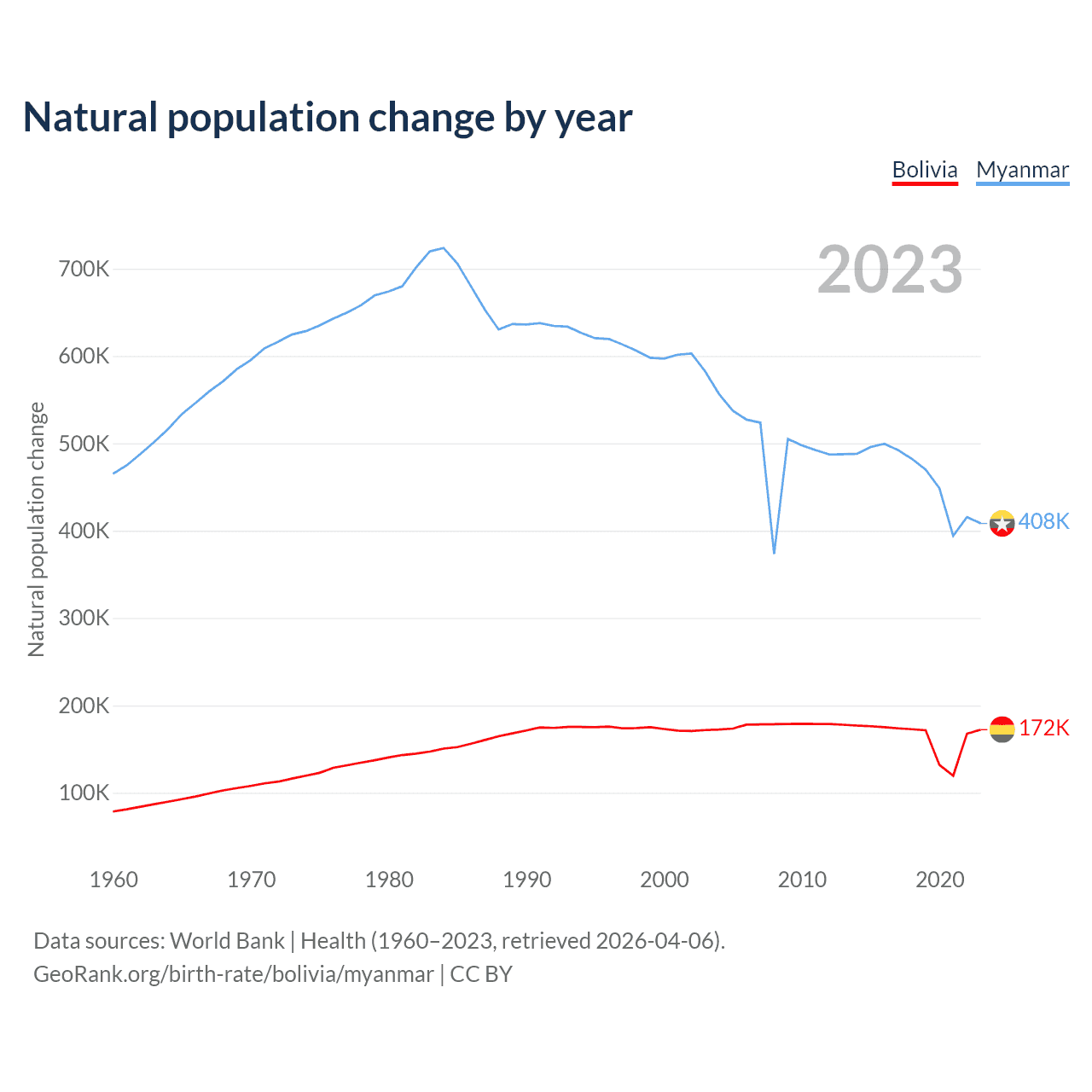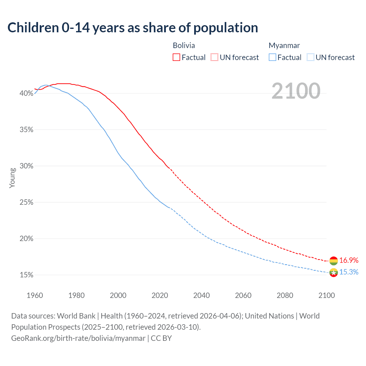 According to the latest available data on birth rates, the fertility rate in Bolivia was 2.55 children per woman in 2023, compared to 2.12 in Myanmar in 2023. The replacement level is considered to be 2.1 children per woman.