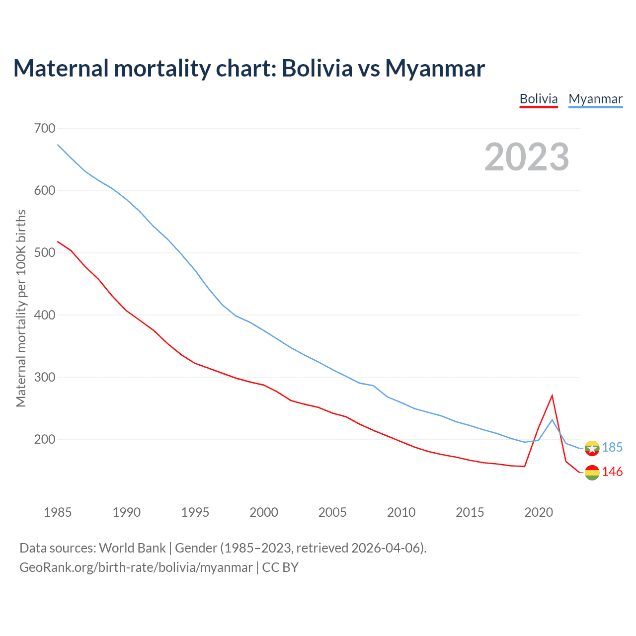 The maternal mortality rate, which is the probability of dying during childbirth or within 42 days of pregnancy termination, is 146 deaths per 100,000 live births in Bolivia, compared to 185 deaths in Myanmar.