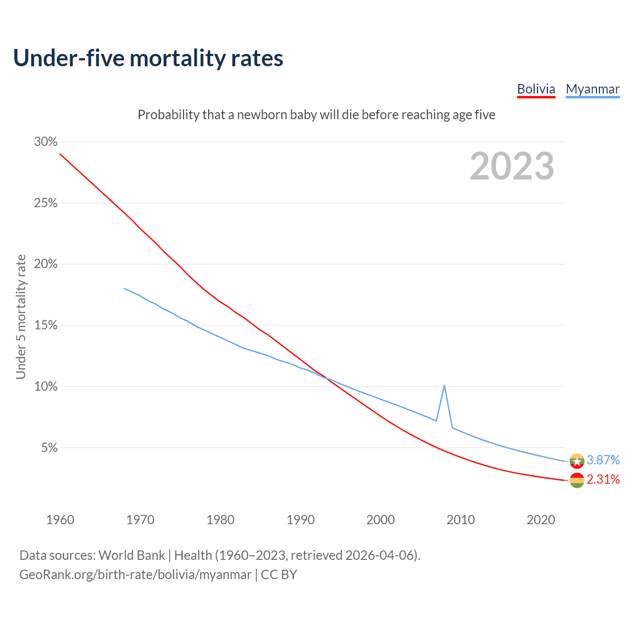 The chance that a newborn baby will die before reaching age five is 2.31% in Bolivia and 3.87% in Myanmar. Above is a chart with historical data on under-five mortality rates.