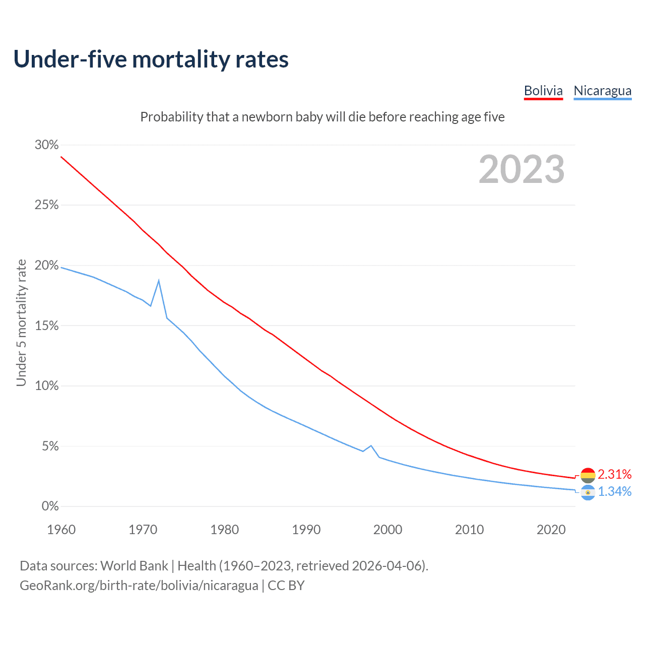 The chance that a newborn baby will die before reaching age five is 2.31% in Bolivia and 1.34% in Nicaragua. Above is a chart with historical data on under-five mortality rates.