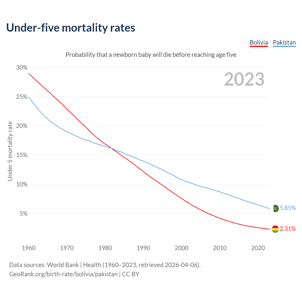 The chance that a newborn baby will die before reaching age five is 2.31% in Bolivia and 5.85% in Pakistan. Above is a chart with historical data on under-five mortality rates.