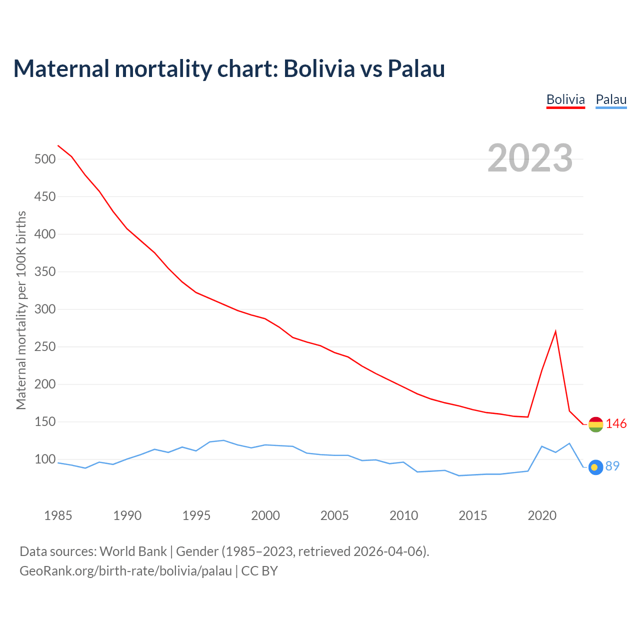 The maternal mortality rate, which is the probability of dying during childbirth or within 42 days of pregnancy termination, is 146 deaths per 100,000 live births in Bolivia, compared to 89 deaths in Palau.