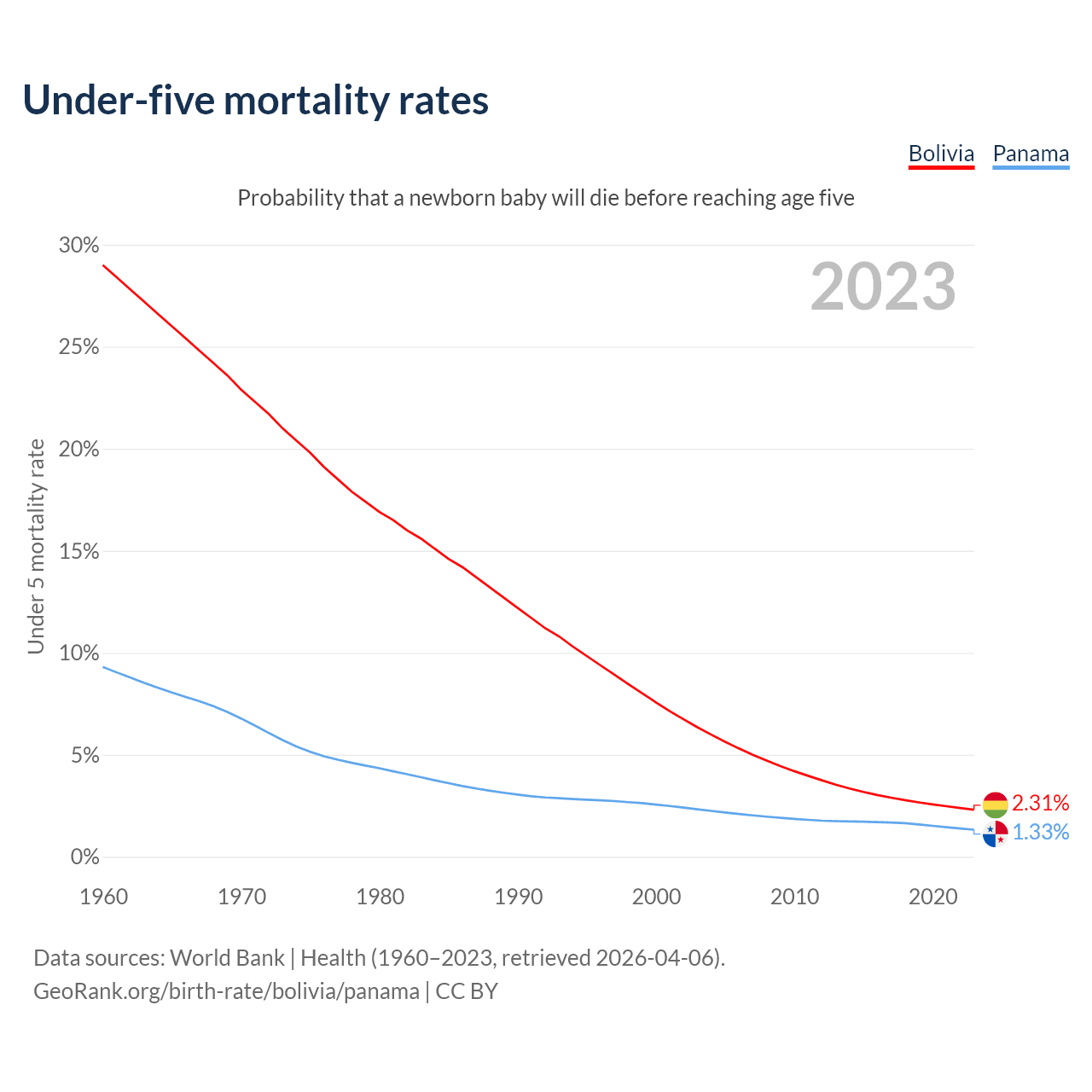 The chance that a newborn baby will die before reaching age five is 2.31% in Bolivia and 1.33% in Panama. Above is a chart with historical data on under-five mortality rates.