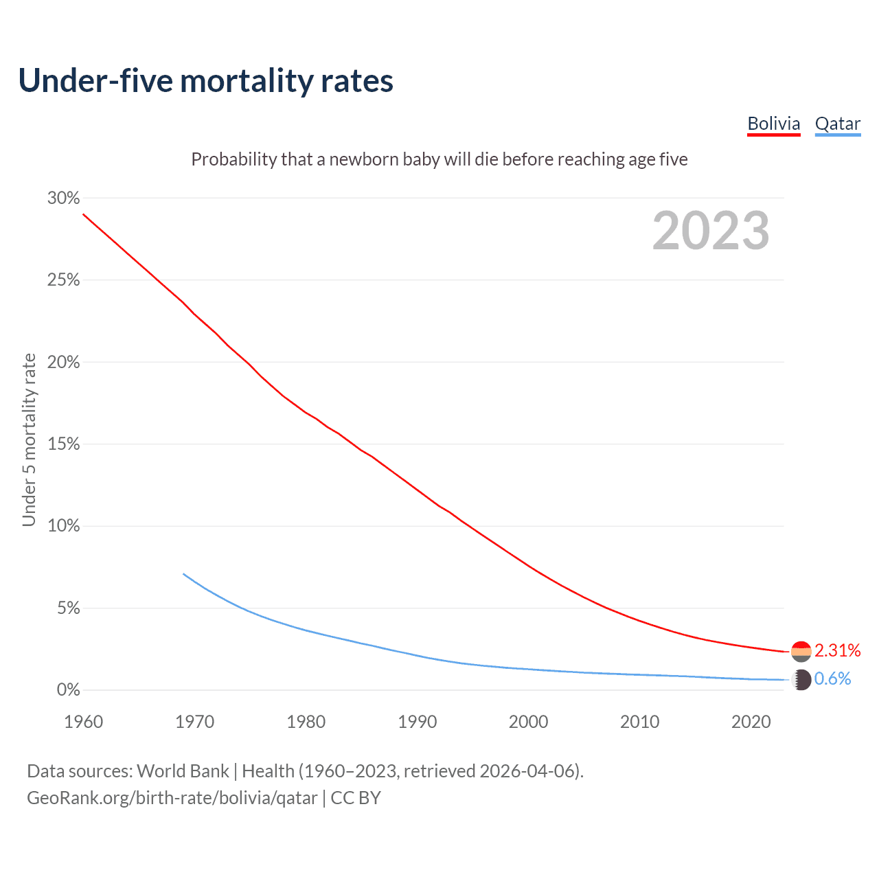 The chance that a newborn baby will die before reaching age five is 2.31% in Bolivia and 0.6% in Qatar. Above is a chart with historical data on under-five mortality rates.