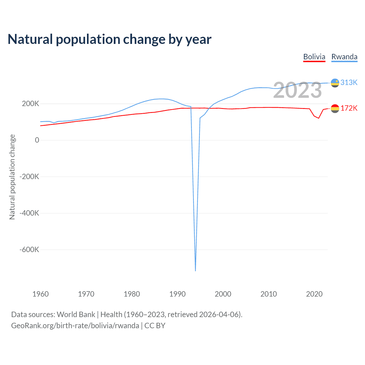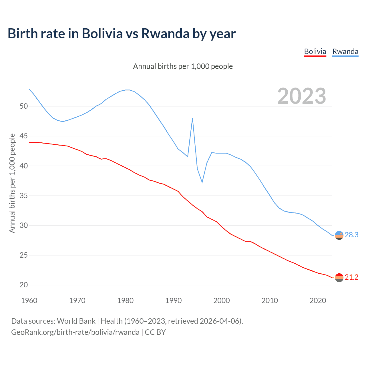 Bolivia has an annual birth rate of 21.2 births per 1,000 people, compared to 28.3 for Rwanda. The average number of children a woman is expected to have during her lifetime — the fertility rate, is 2.55 in Bolivia and 3.7 in Rwanda — 45.2% difference.