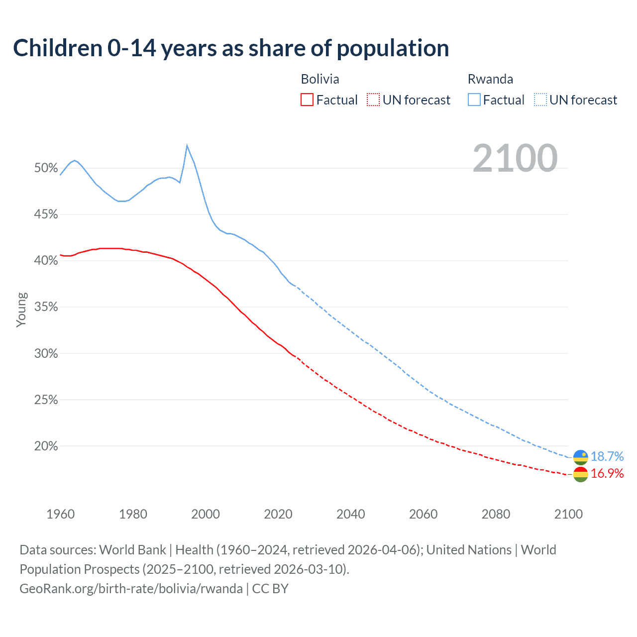 According to the latest available data on birth rates, the fertility rate in Bolivia was 2.55 children per woman in 2023, compared to 3.7 in Rwanda in 2023. The replacement level is considered to be 2.1 children per woman.