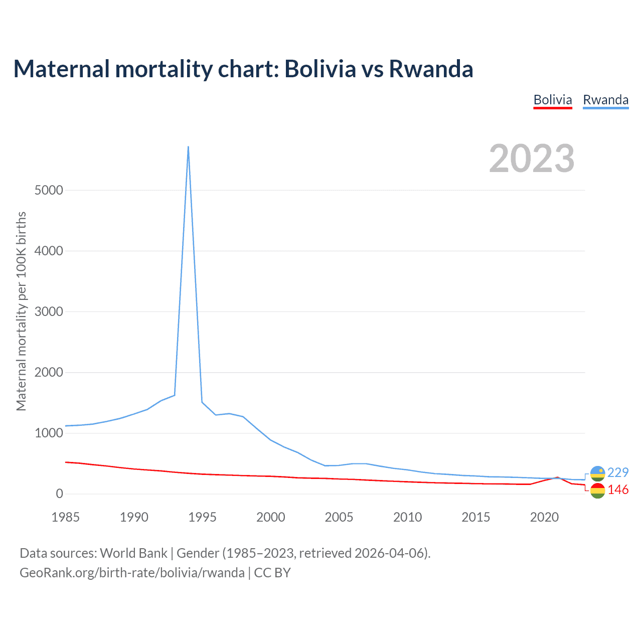 The maternal mortality rate, which is the probability of dying during childbirth or within 42 days of pregnancy termination, is 146 deaths per 100,000 live births in Bolivia, compared to 229 deaths in Rwanda.
