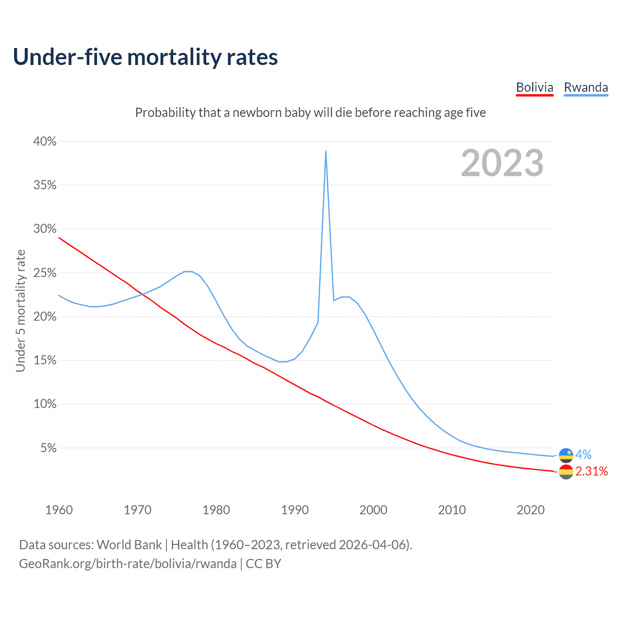 The chance that a newborn baby will die before reaching age five is 2.31% in Bolivia and 4% in Rwanda. Above is a chart with historical data on under-five mortality rates.