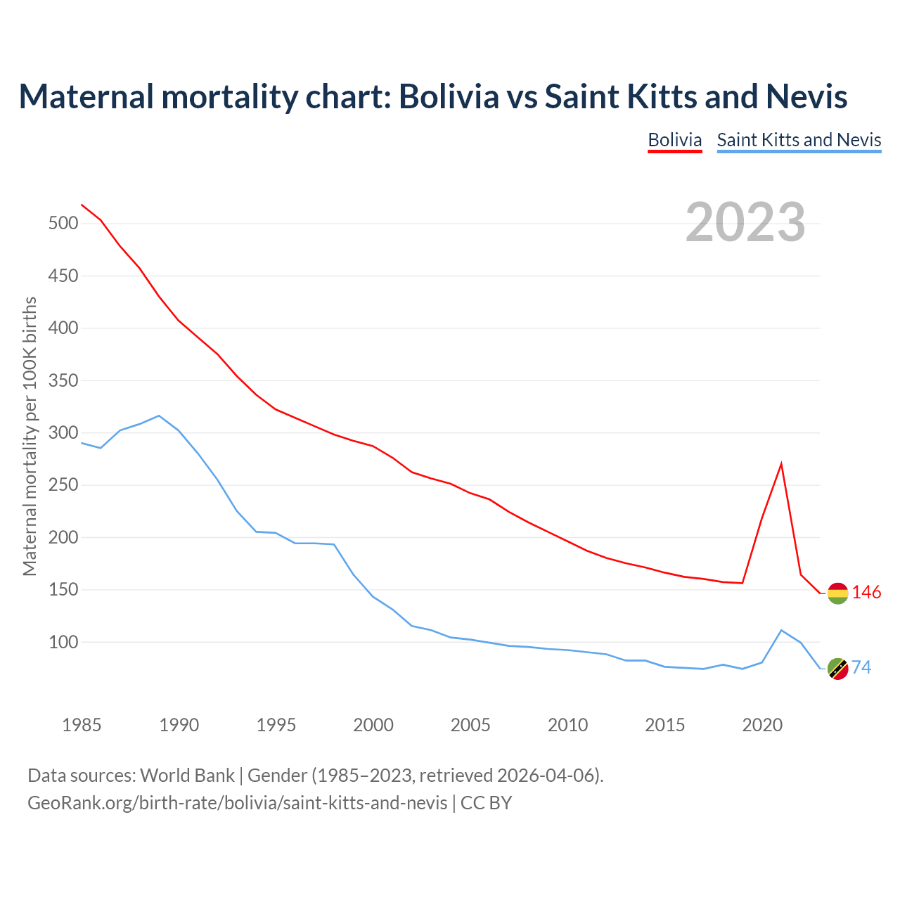 The maternal mortality rate, which is the probability of dying during childbirth or within 42 days of pregnancy termination, is 146 deaths per 100,000 live births in Bolivia, compared to 74 deaths in Saint Kitts and Nevis.