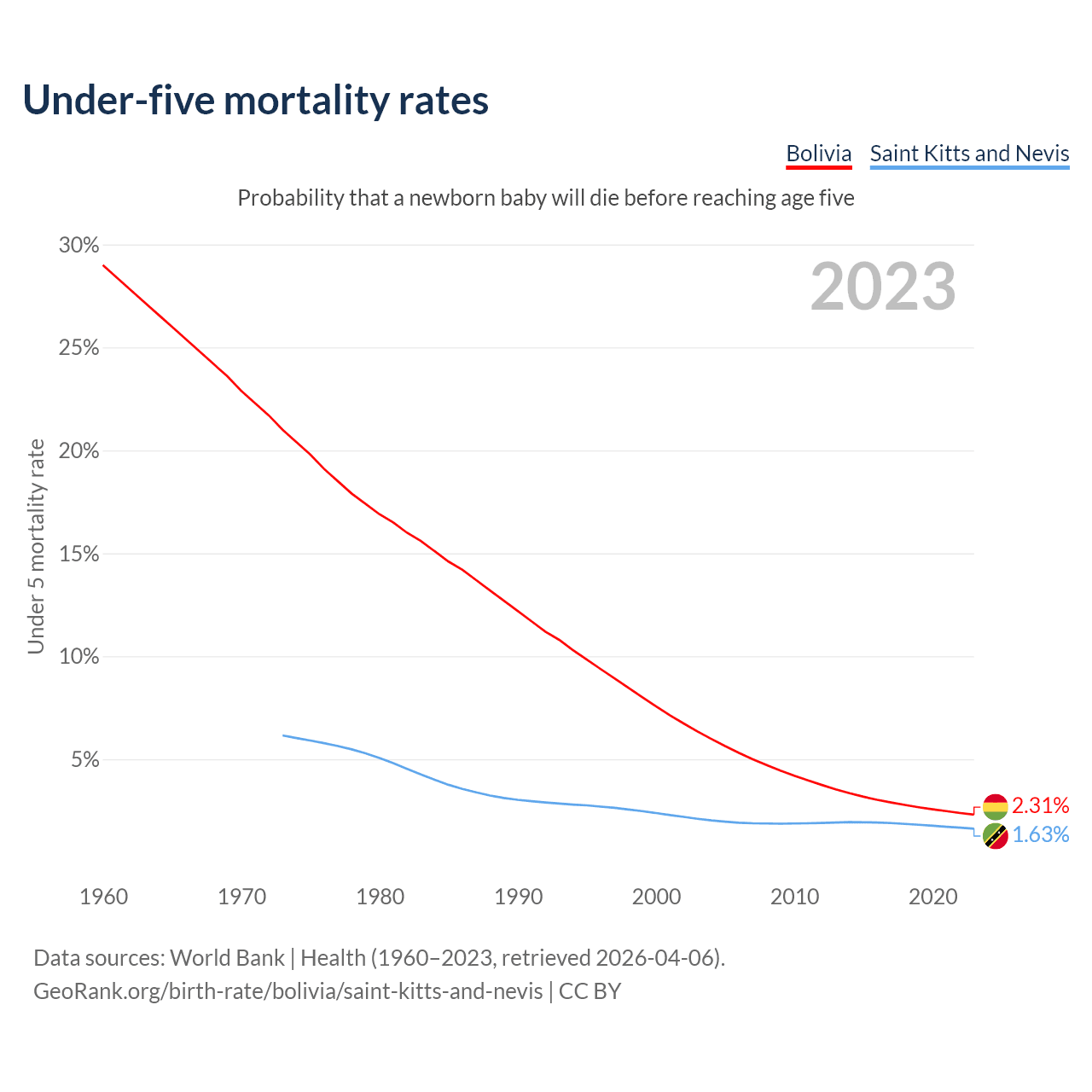 The chance that a newborn baby will die before reaching age five is 2.31% in Bolivia and 1.63% in Saint Kitts and Nevis. Above is a chart with historical data on under-five mortality rates.