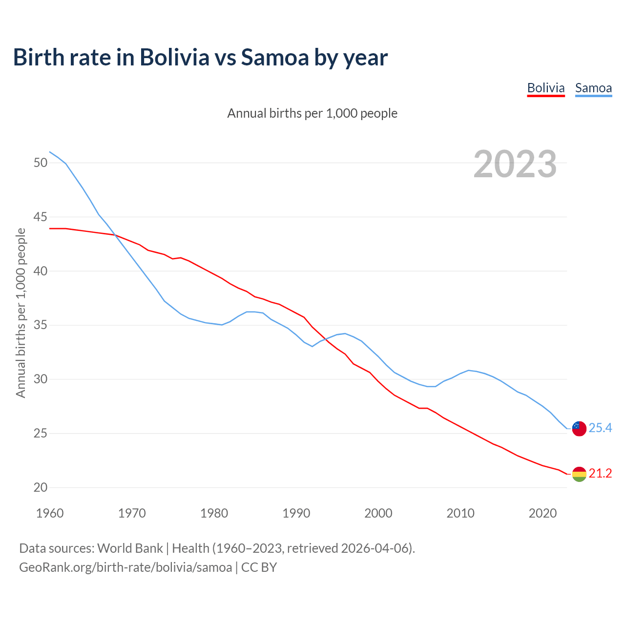 Bolivia has an annual birth rate of 21.2 births per 1,000 people, compared to 25.4 for Samoa. The average number of children a woman is expected to have during her lifetime — the fertility rate, is 2.55 in Bolivia and 3.83 in Samoa — 50.3% difference.