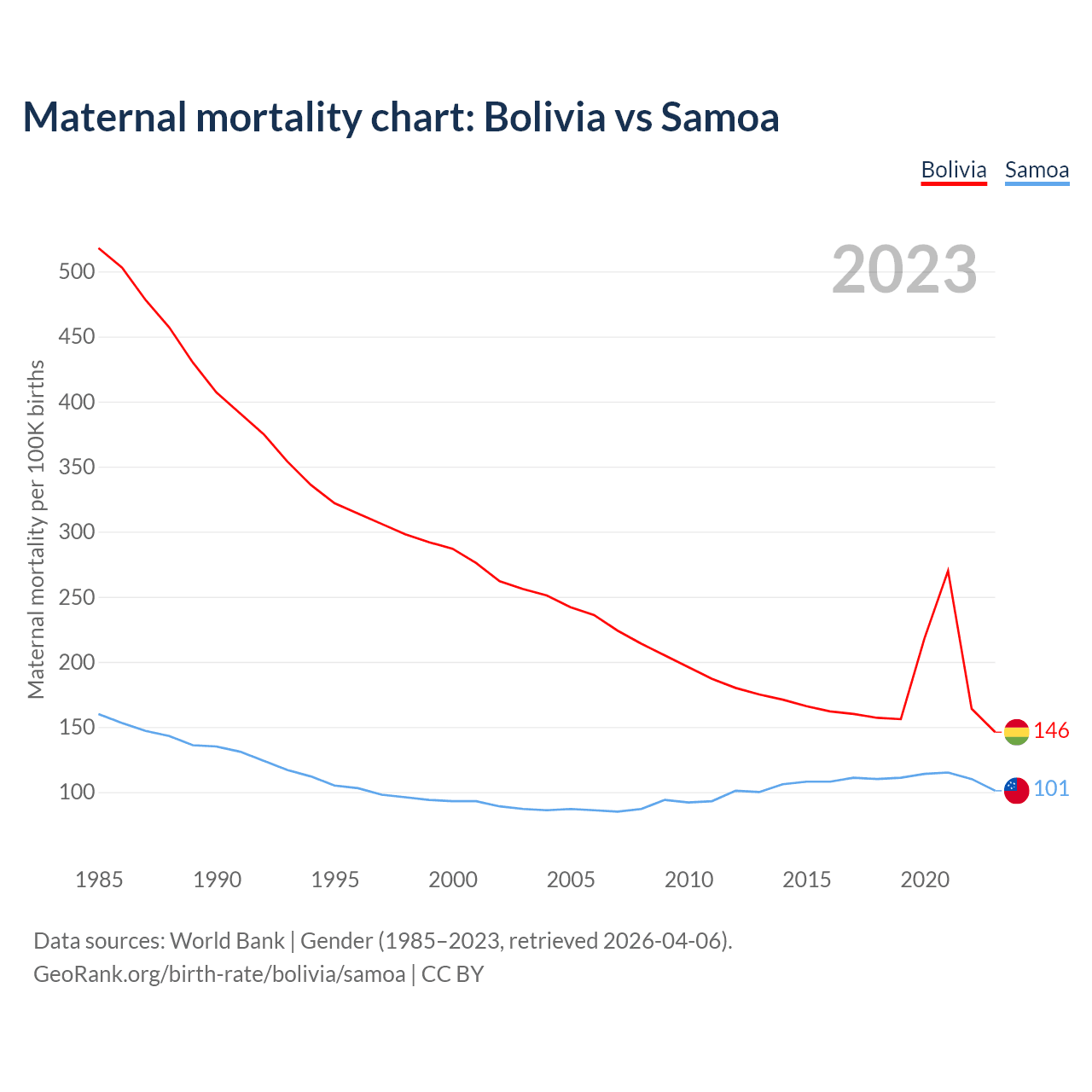 The maternal mortality rate, which is the probability of dying during childbirth or within 42 days of pregnancy termination, is 146 deaths per 100,000 live births in Bolivia, compared to 101 deaths in Samoa.