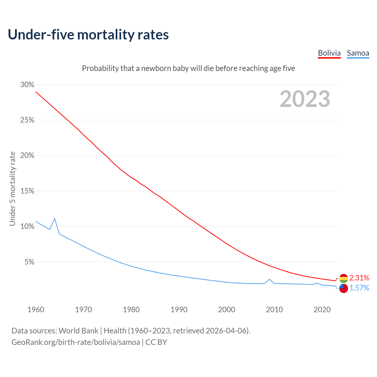 The chance that a newborn baby will die before reaching age five is 2.31% in Bolivia and 1.57% in Samoa. Above is a chart with historical data on under-five mortality rates.
