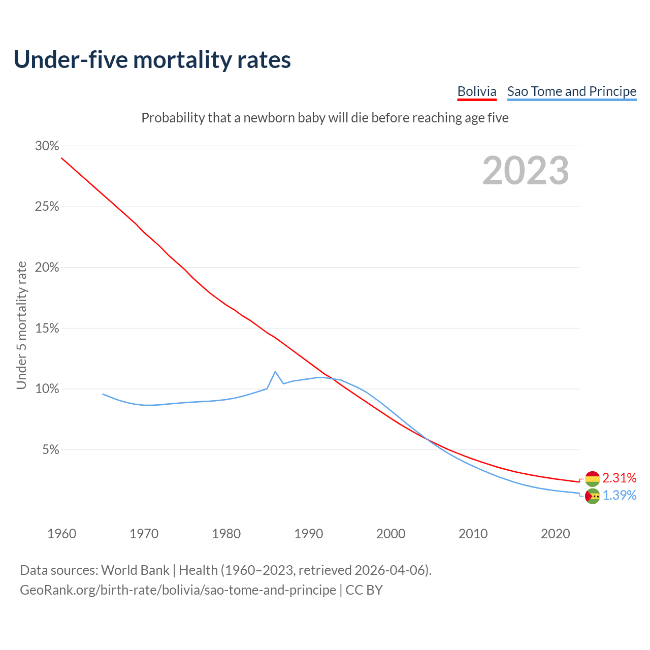 The chance that a newborn baby will die before reaching age five is 2.31% in Bolivia and 1.39% in Sao Tome and Principe. Above is a chart with historical data on under-five mortality rates.