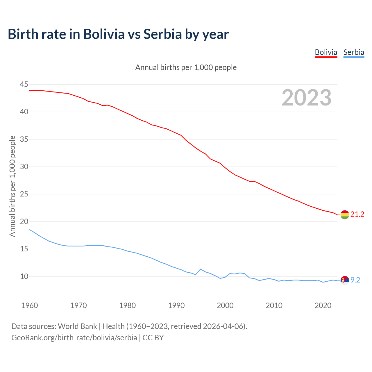 Bolivia has an annual birth rate of 21.2 births per 1,000 people, compared to 9.2 for Serbia. The average number of children a woman is expected to have during her lifetime — the fertility rate, is 2.55 in Bolivia and 1.61 in Serbia — 36.8% difference.