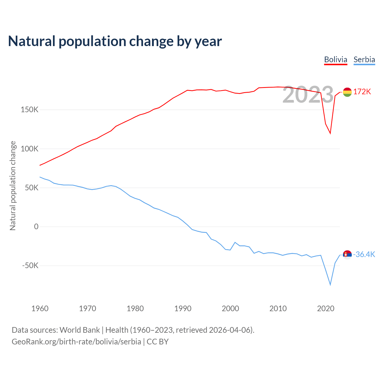 According to the latest available data on birth rates, the fertility rate in Bolivia was 2.55 children per woman in 2023, compared to 1.61 in Serbia in 2023. The replacement level is considered to be 2.1 children per woman.