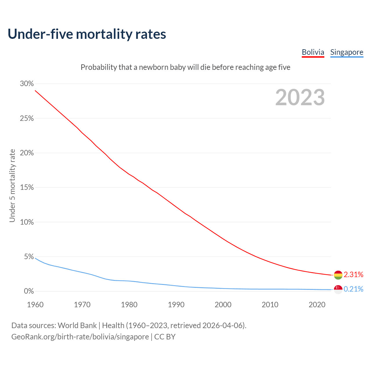 The chance that a newborn baby will die before reaching age five is 2.31% in Bolivia and 0.21% in Singapore. Above is a chart with historical data on under-five mortality rates.