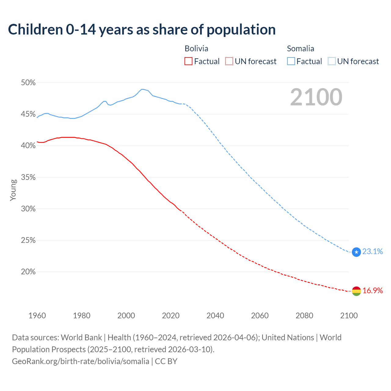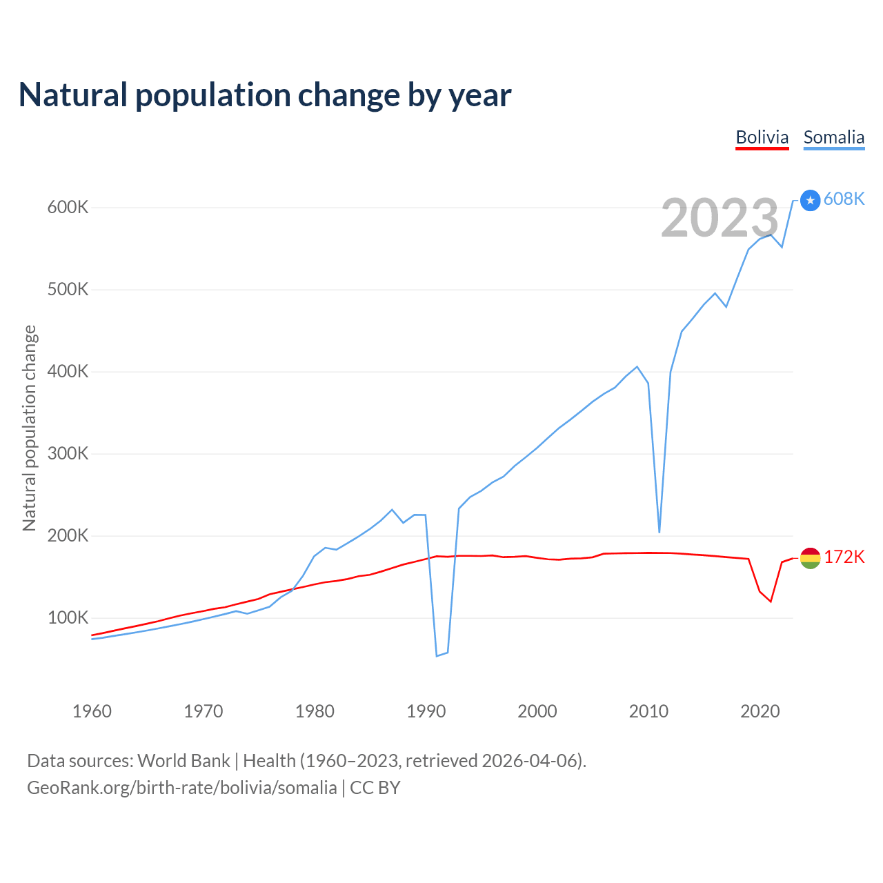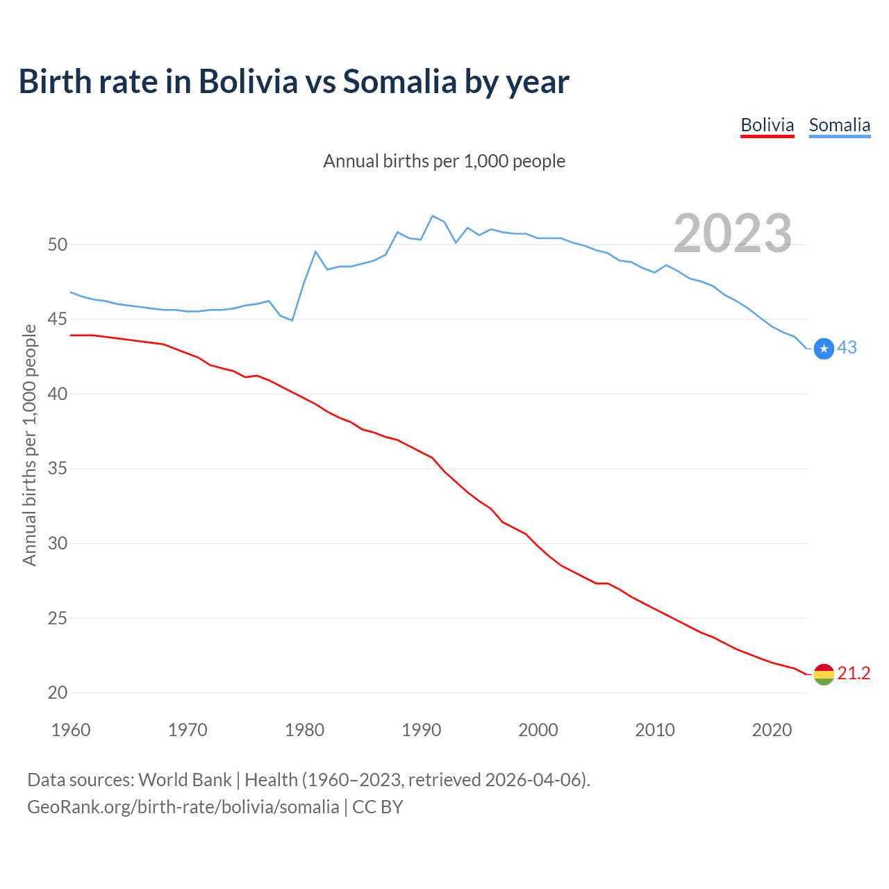 Bolivia has an annual birth rate of 21.2 births per 1,000 people, compared to 43 for Somalia. The average number of children a woman is expected to have during her lifetime — the fertility rate, is 2.55 in Bolivia and 6.13 in Somalia — 140.8% difference.