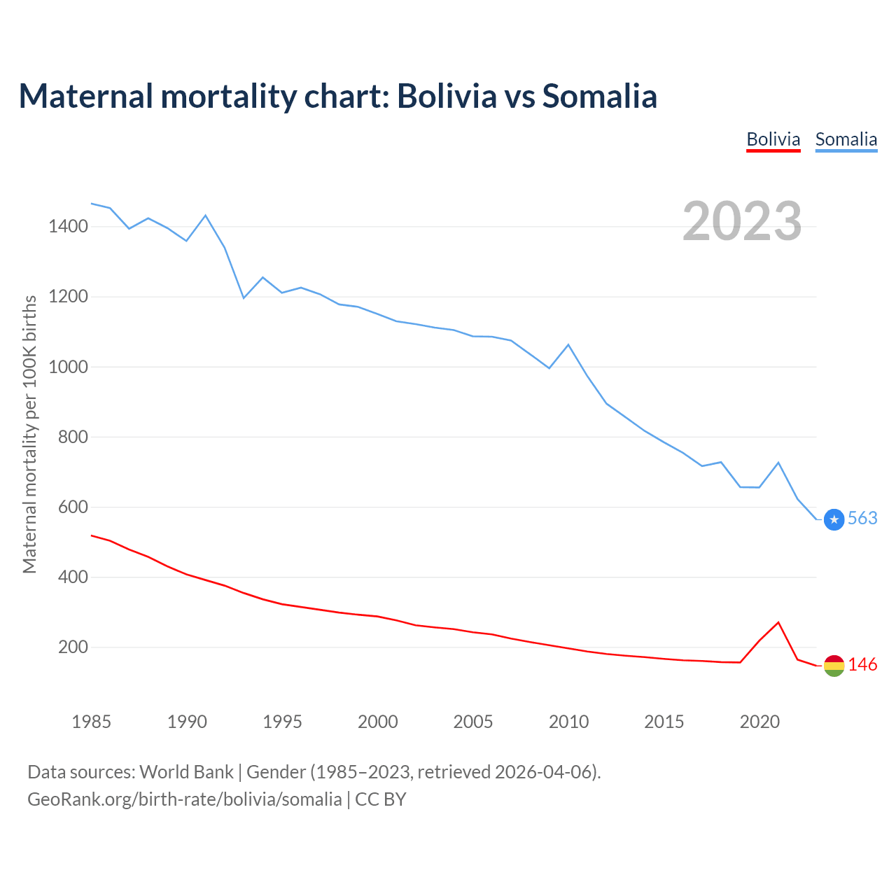 The maternal mortality rate, which is the probability of dying during childbirth or within 42 days of pregnancy termination, is 146 deaths per 100,000 live births in Bolivia, compared to 563 deaths in Somalia.