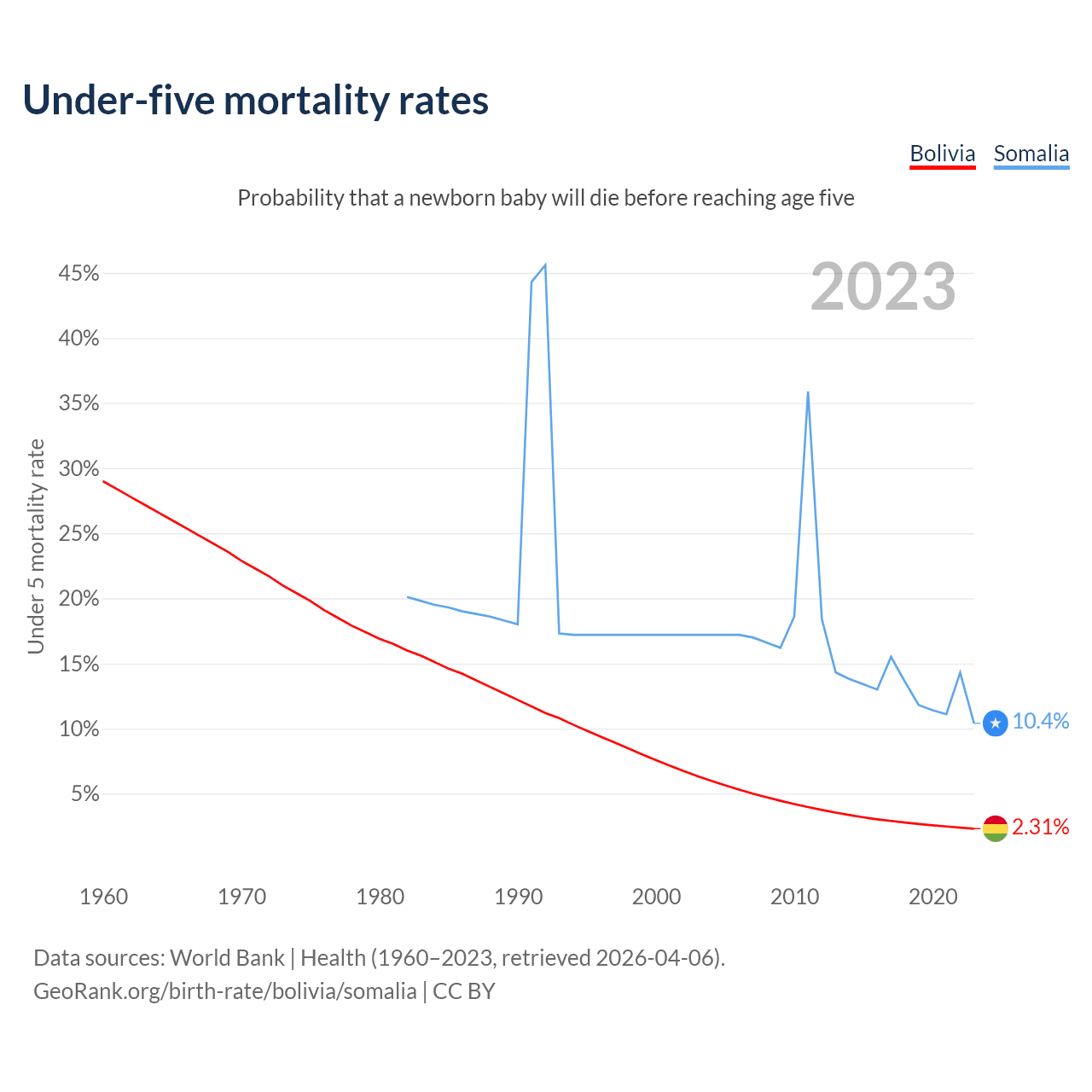 The chance that a newborn baby will die before reaching age five is 2.31% in Bolivia and 10.4% in Somalia. Above is a chart with historical data on under-five mortality rates.