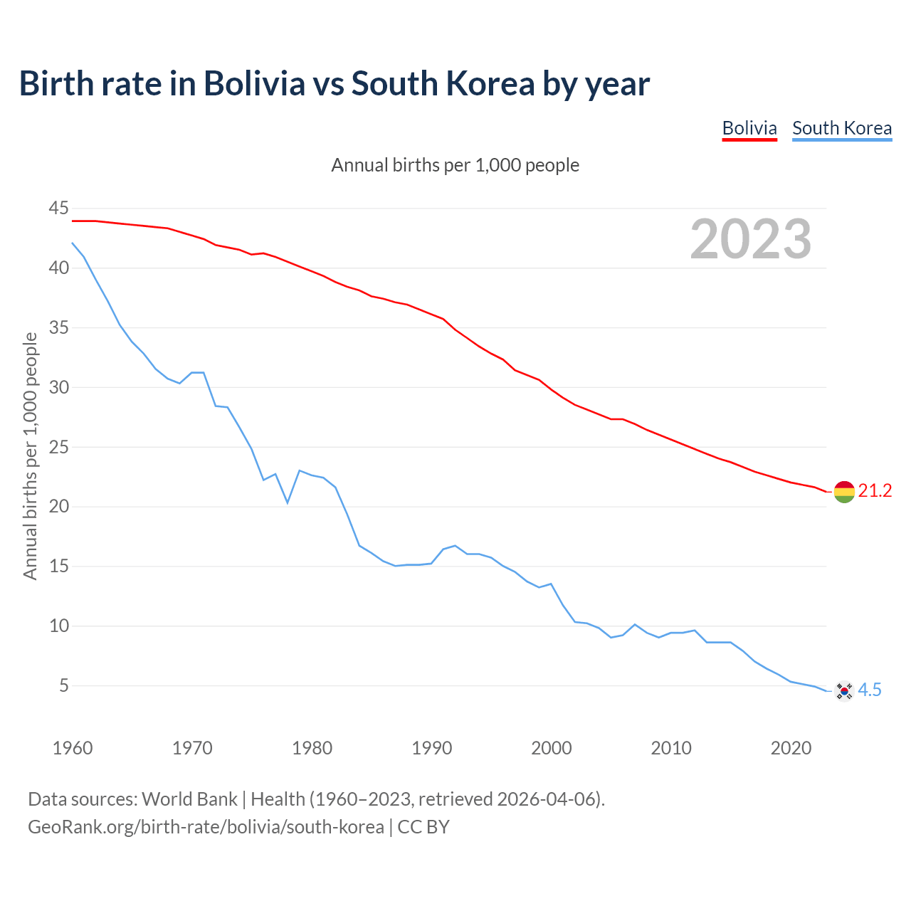 Bolivia has an annual birth rate of 21.2 births per 1,000 people, compared to 4.5 for South Korea. The average number of children a woman is expected to have during her lifetime — the fertility rate, is 2.55 in Bolivia and 0.72 in South Korea — 71.7% difference.