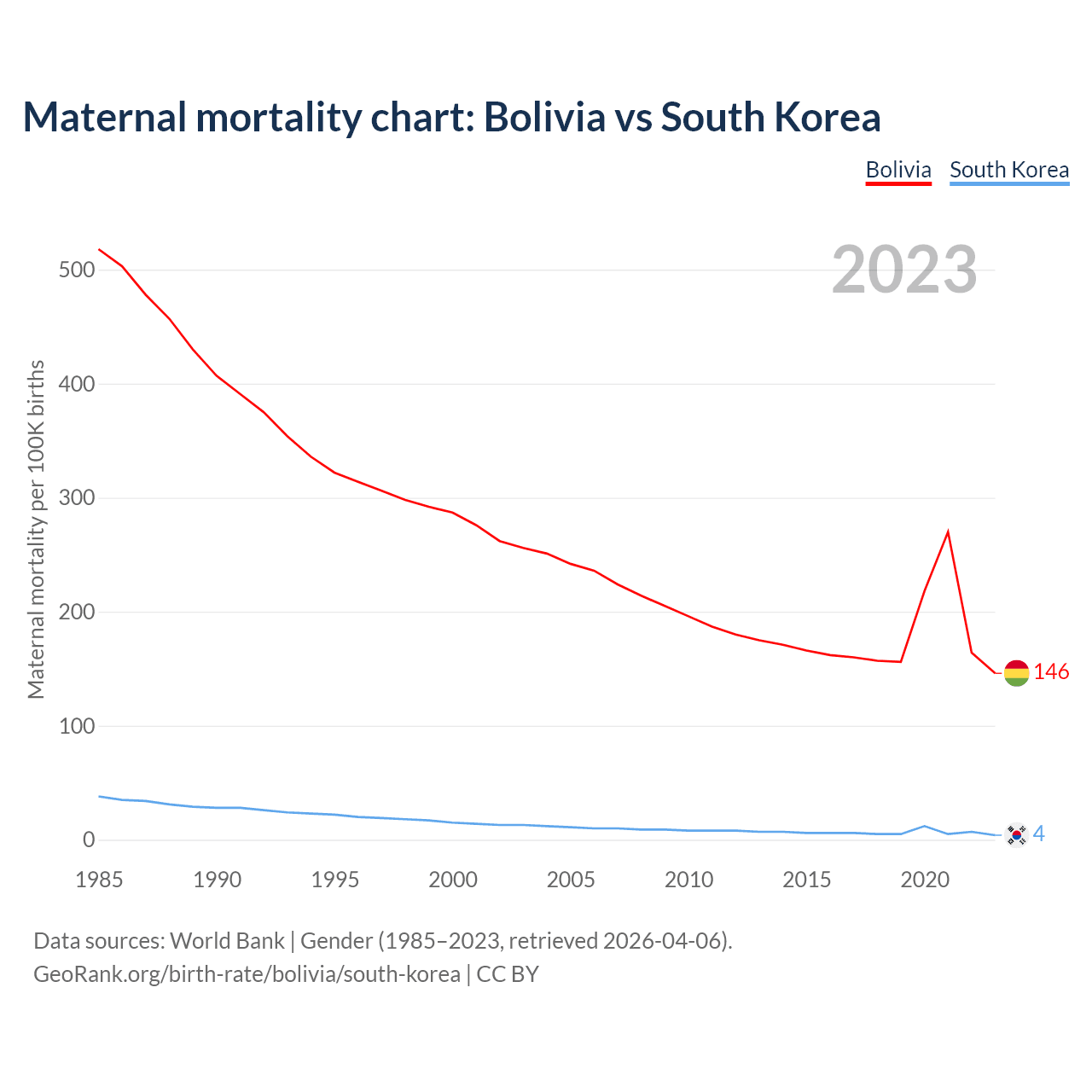 The maternal mortality rate, which is the probability of dying during childbirth or within 42 days of pregnancy termination, is 146 deaths per 100,000 live births in Bolivia, compared to 4 deaths in South Korea.