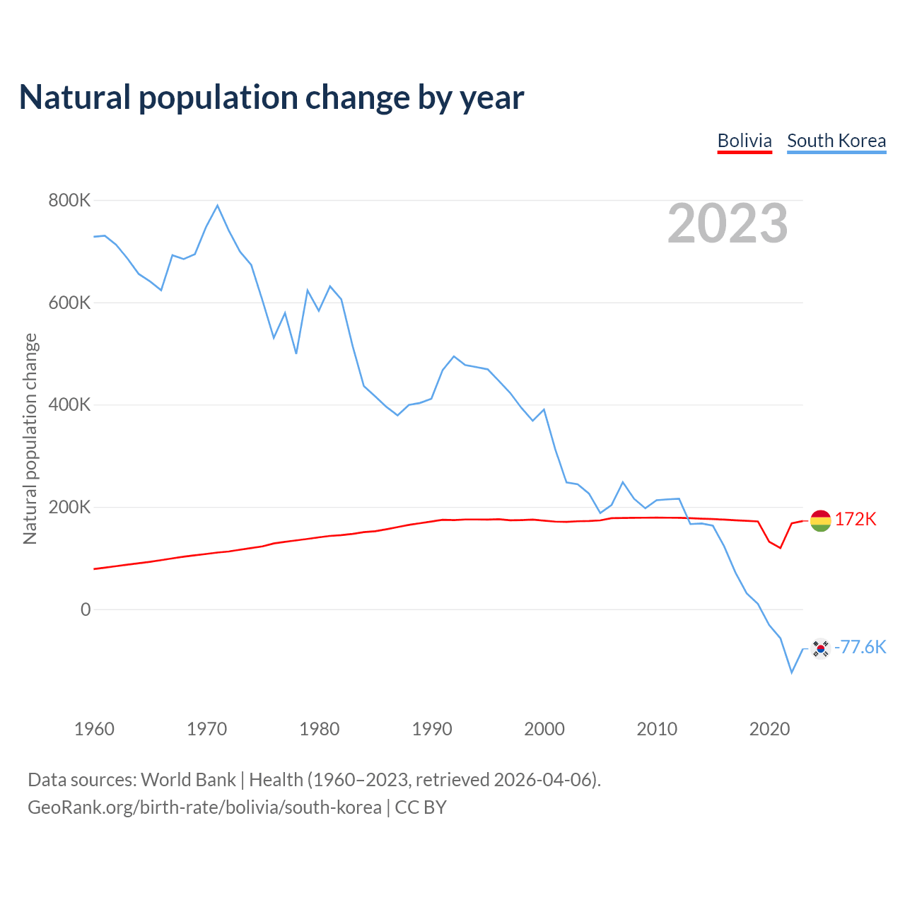 According to the latest available data on birth rates, the fertility rate in Bolivia was 2.55 children per woman in 2023, compared to 0.72 in South Korea in 2023. The replacement level is considered to be 2.1 children per woman.
