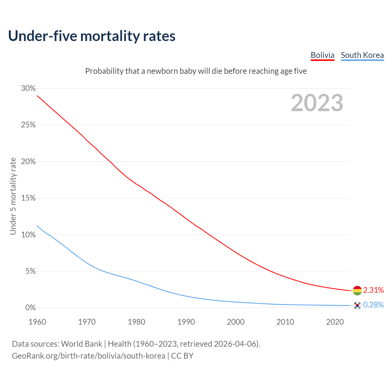 The chance that a newborn baby will die before reaching age five is 2.31% in Bolivia and 0.28% in South Korea. Above is a chart with historical data on under-five mortality rates.