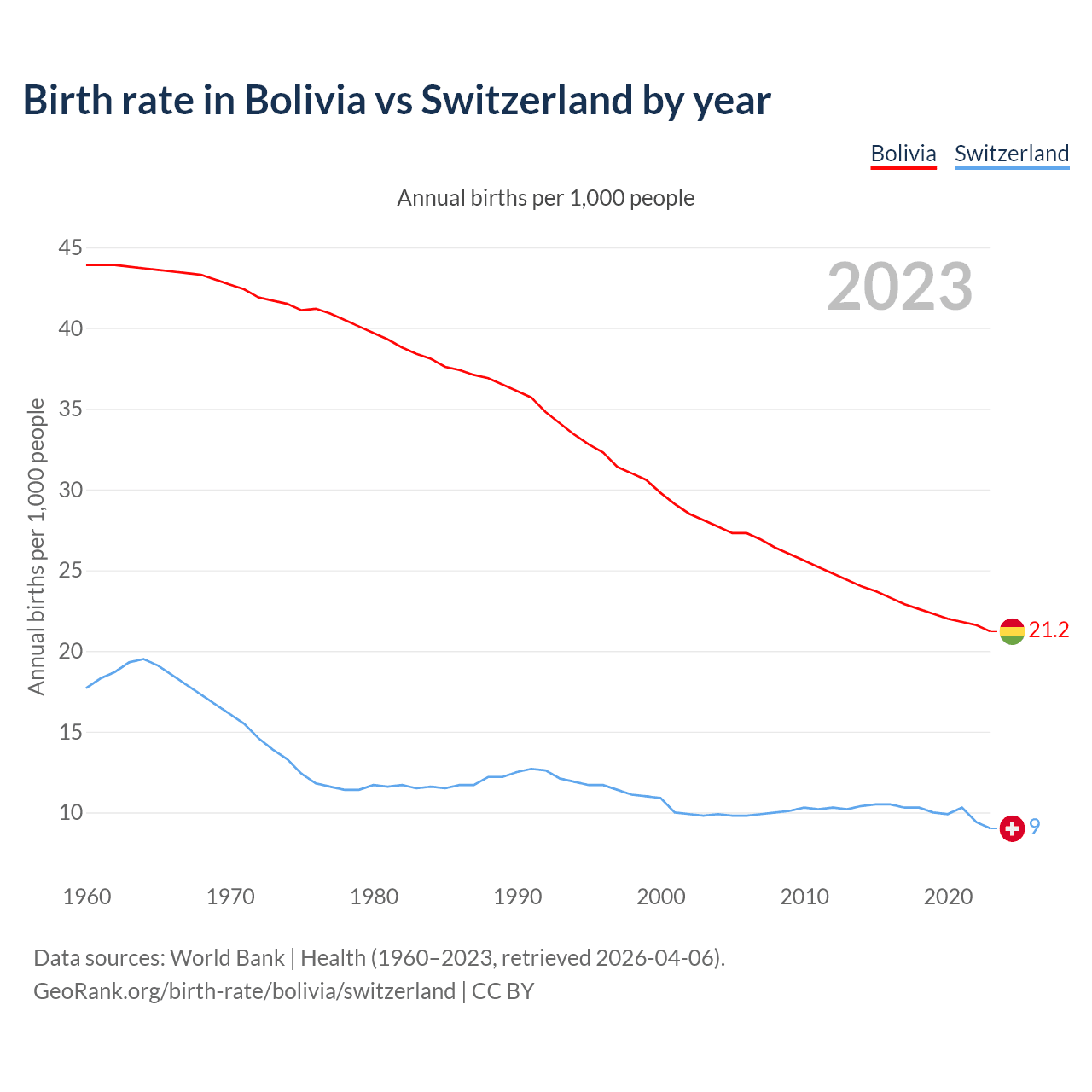 Bolivia has an annual birth rate of 21.2 births per 1,000 people, compared to 9 for Switzerland. The average number of children a woman is expected to have during her lifetime — the fertility rate, is 2.55 in Bolivia and 1.33 in Switzerland — 47.8% difference.