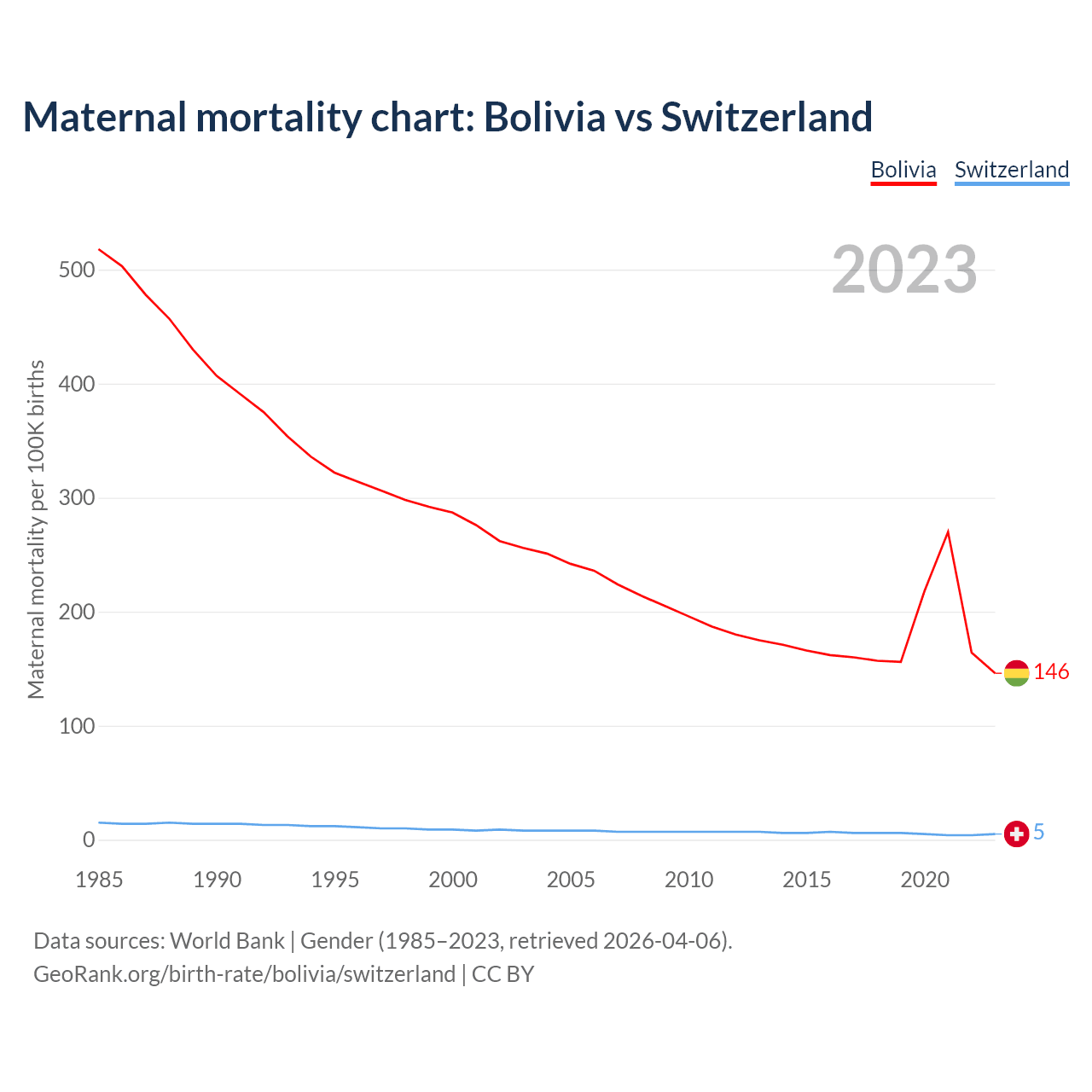 The maternal mortality rate, which is the probability of dying during childbirth or within 42 days of pregnancy termination, is 146 deaths per 100,000 live births in Bolivia, compared to 5 deaths in Switzerland.
