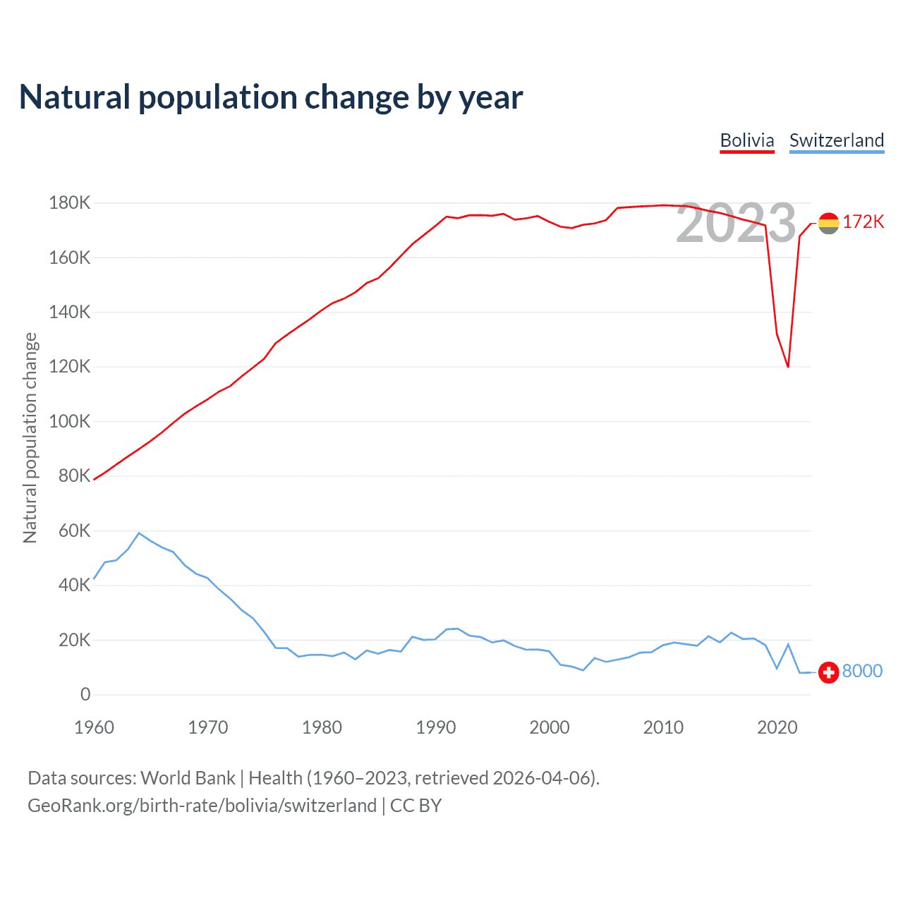 According to the latest available data on birth rates, the fertility rate in Bolivia was 2.55 children per woman in 2023, compared to 1.33 in Switzerland in 2023. The replacement level is considered to be 2.1 children per woman.