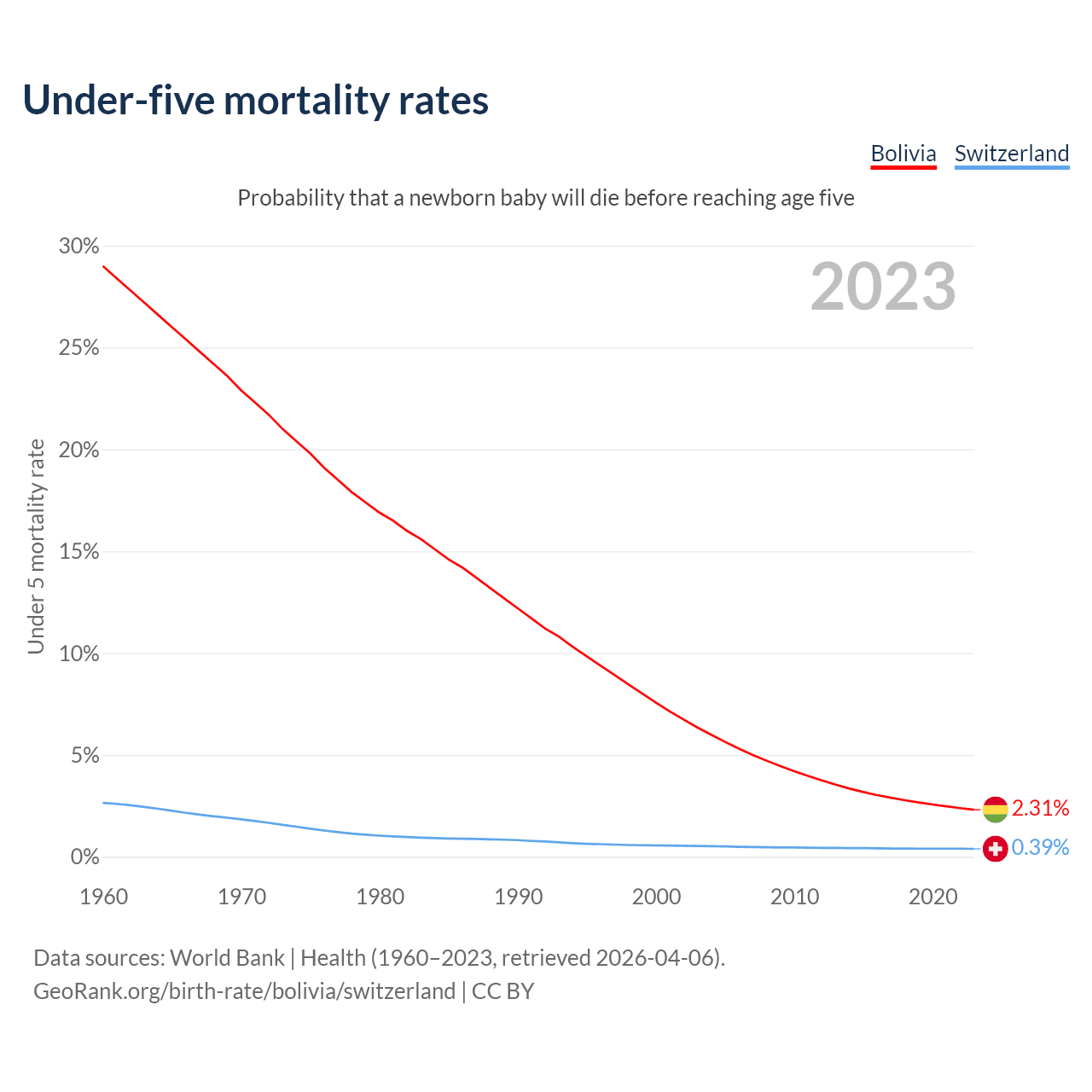 The chance that a newborn baby will die before reaching age five is 2.31% in Bolivia and 0.39% in Switzerland. Above is a chart with historical data on under-five mortality rates.