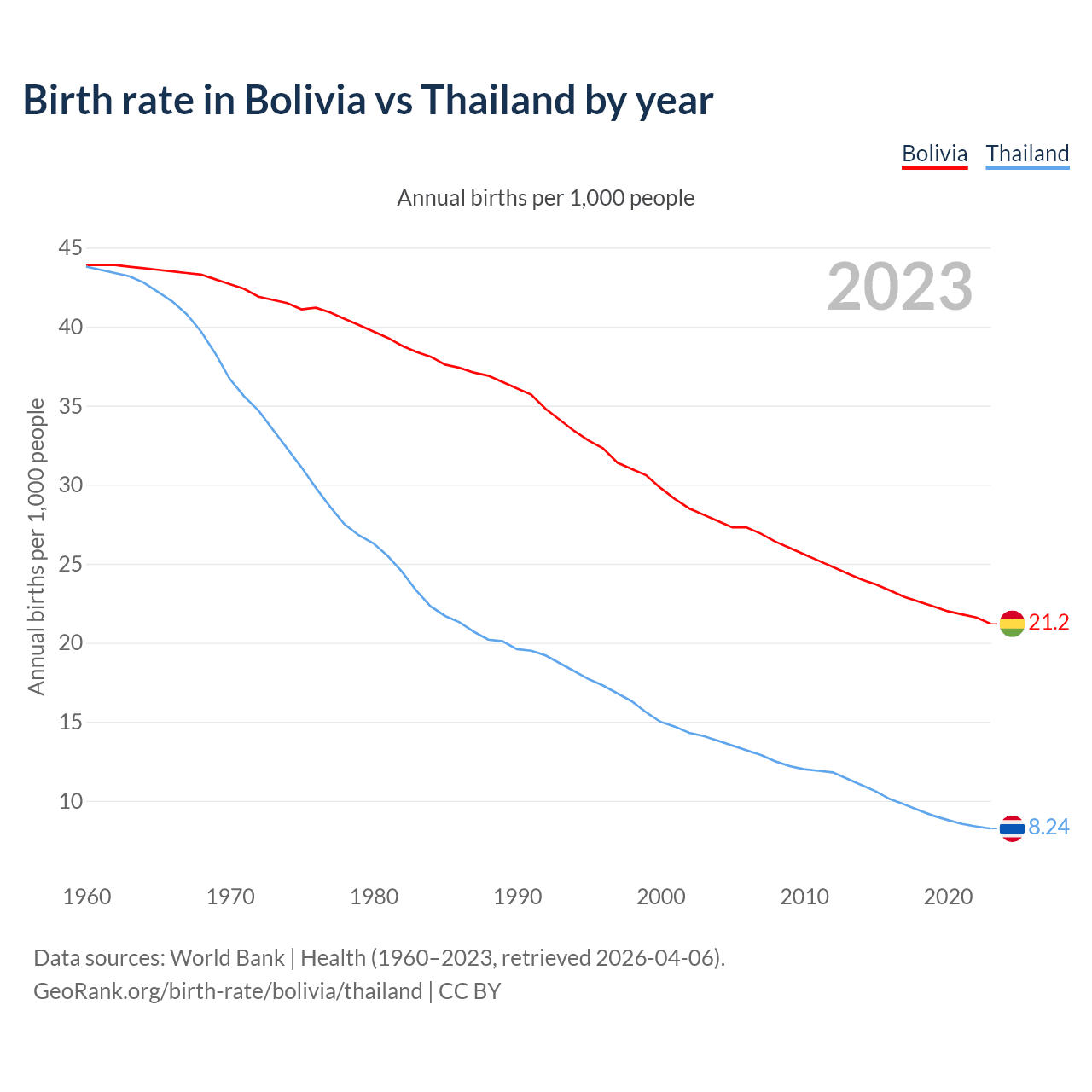 Bolivia has an annual birth rate of 21.2 births per 1,000 people, compared to 8.24 for Thailand. The average number of children a woman is expected to have during her lifetime — the fertility rate, is 2.55 in Bolivia and 1.21 in Thailand — 52.4% difference.