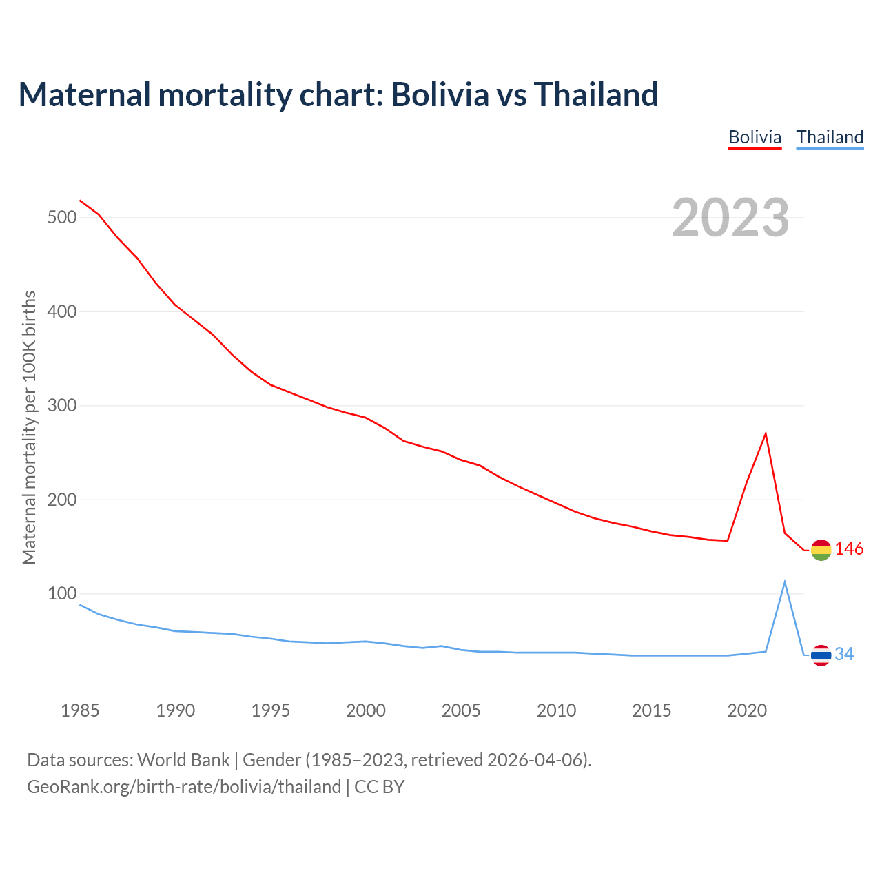 The maternal mortality rate, which is the probability of dying during childbirth or within 42 days of pregnancy termination, is 146 deaths per 100,000 live births in Bolivia, compared to 34 deaths in Thailand.