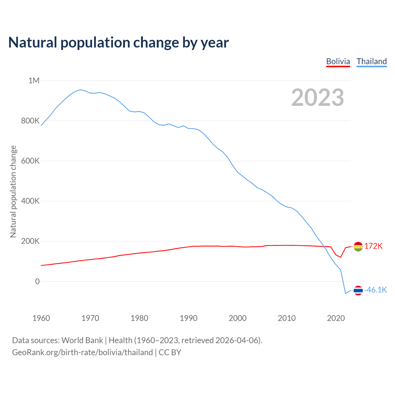 According to the latest available data on birth rates, the fertility rate in Bolivia was 2.55 children per woman in 2023, compared to 1.21 in Thailand in 2023. The replacement level is considered to be 2.1 children per woman.