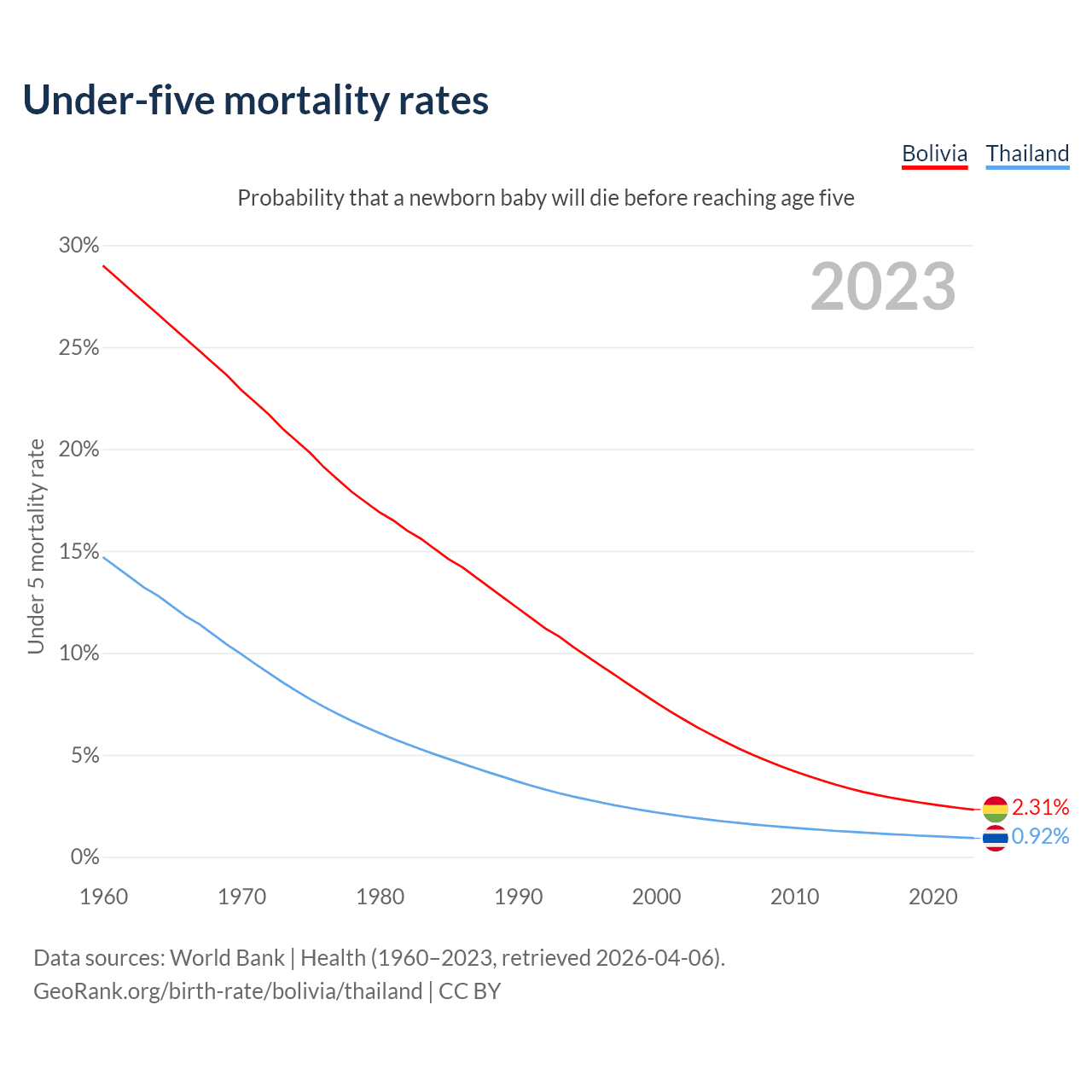 The chance that a newborn baby will die before reaching age five is 2.31% in Bolivia and 0.92% in Thailand. Above is a chart with historical data on under-five mortality rates.