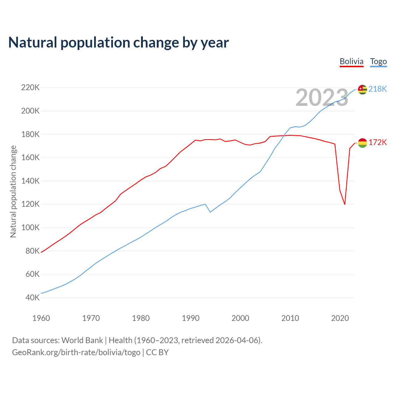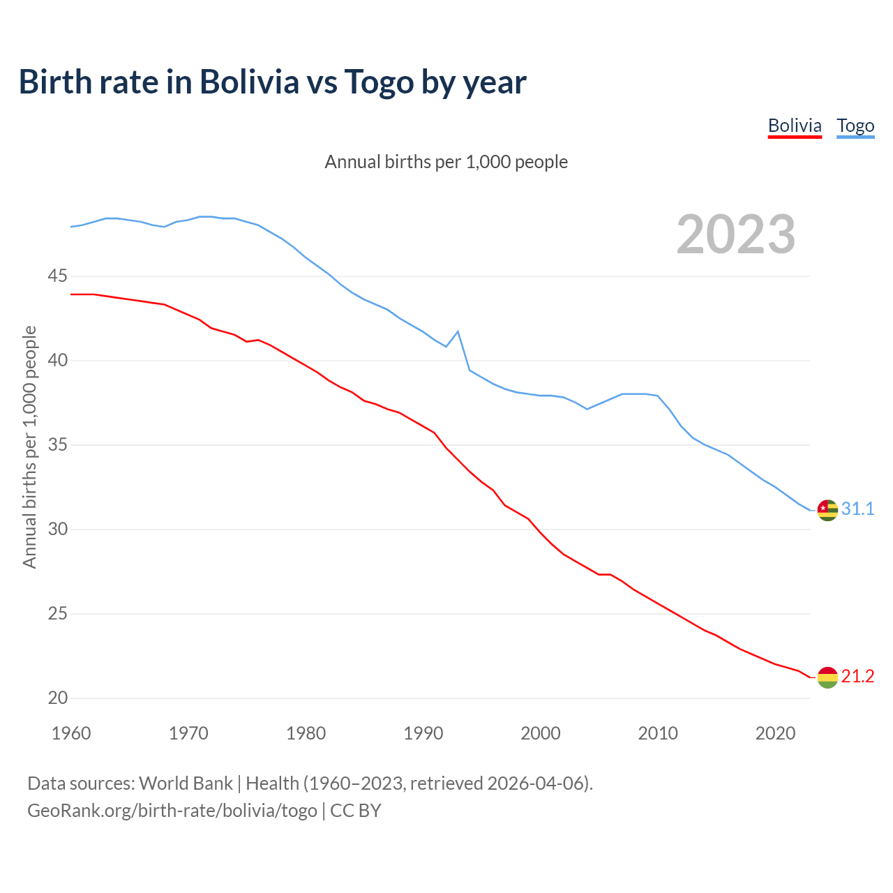 Bolivia has an annual birth rate of 21.2 births per 1,000 people, compared to 31.1 for Togo. The average number of children a woman is expected to have during her lifetime — the fertility rate, is 2.55 in Bolivia and 4.19 in Togo — 64.6% difference.