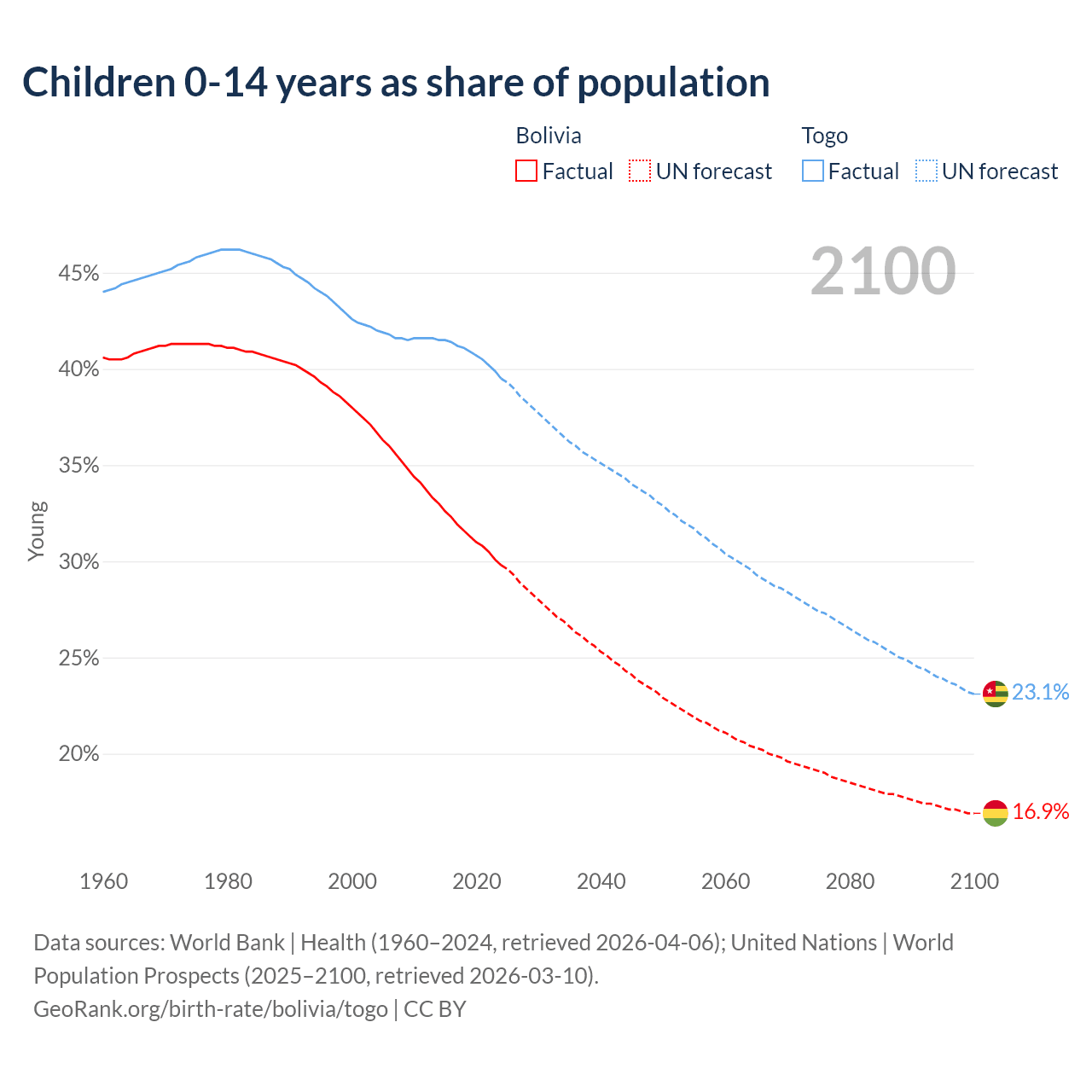 According to the latest available data on birth rates, the fertility rate in Bolivia was 2.55 children per woman in 2023, compared to 4.19 in Togo in 2023. The replacement level is considered to be 2.1 children per woman.
