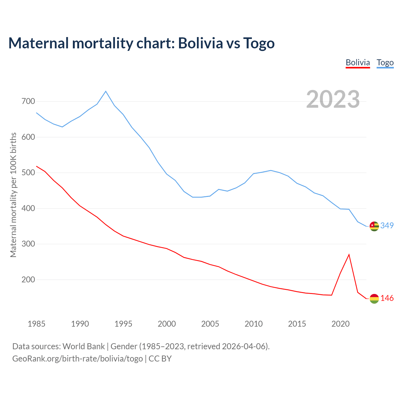 The maternal mortality rate, which is the probability of dying during childbirth or within 42 days of pregnancy termination, is 146 deaths per 100,000 live births in Bolivia, compared to 349 deaths in Togo.