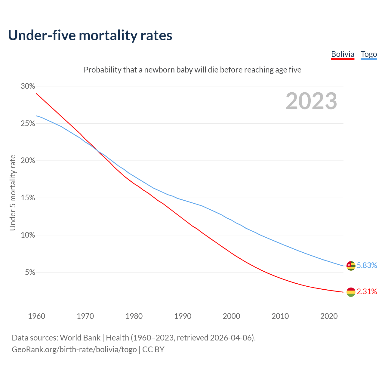 The chance that a newborn baby will die before reaching age five is 2.31% in Bolivia and 5.83% in Togo. Above is a chart with historical data on under-five mortality rates.