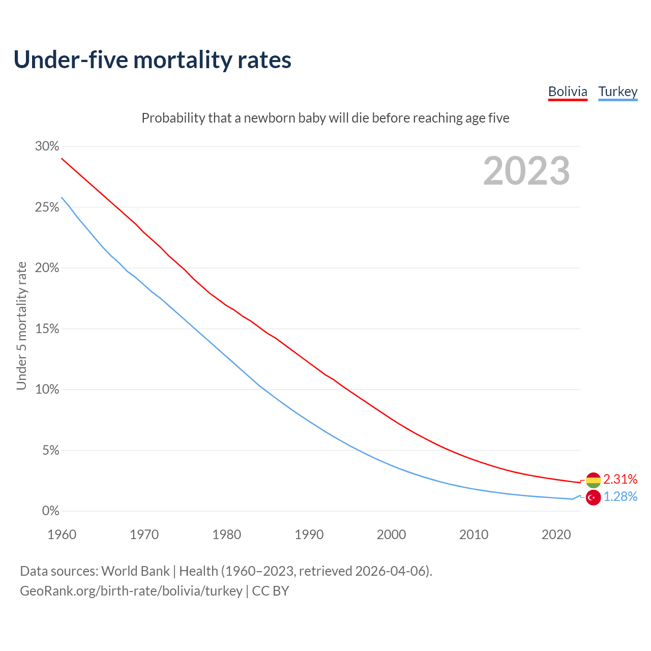 The chance that a newborn baby will die before reaching age five is 2.31% in Bolivia and 1.28% in Turkey. Above is a chart with historical data on under-five mortality rates.