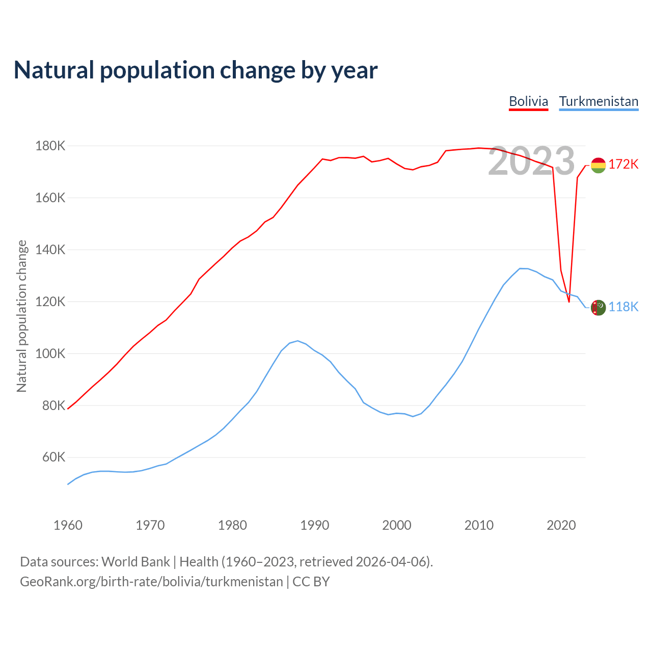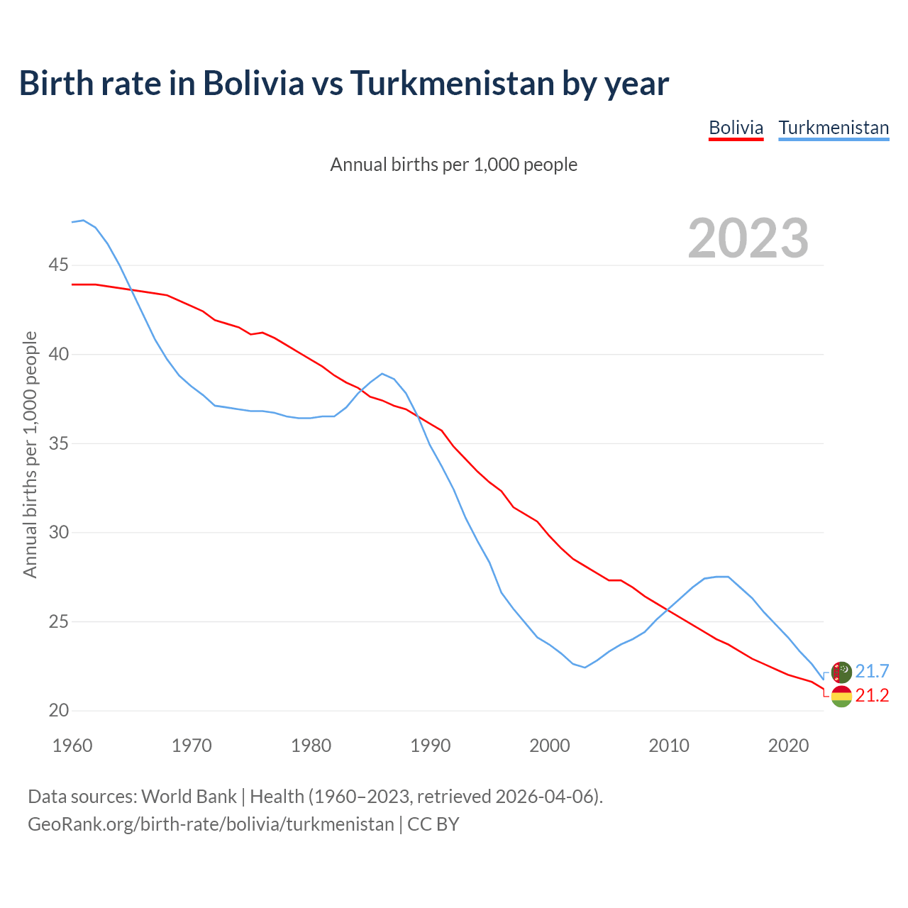 Bolivia has an annual birth rate of 21.2 births per 1,000 people, compared to 21.7 for Turkmenistan. The average number of children a woman is expected to have during her lifetime — the fertility rate, is 2.55 in Bolivia and 2.69 in Turkmenistan — 5.61% difference.