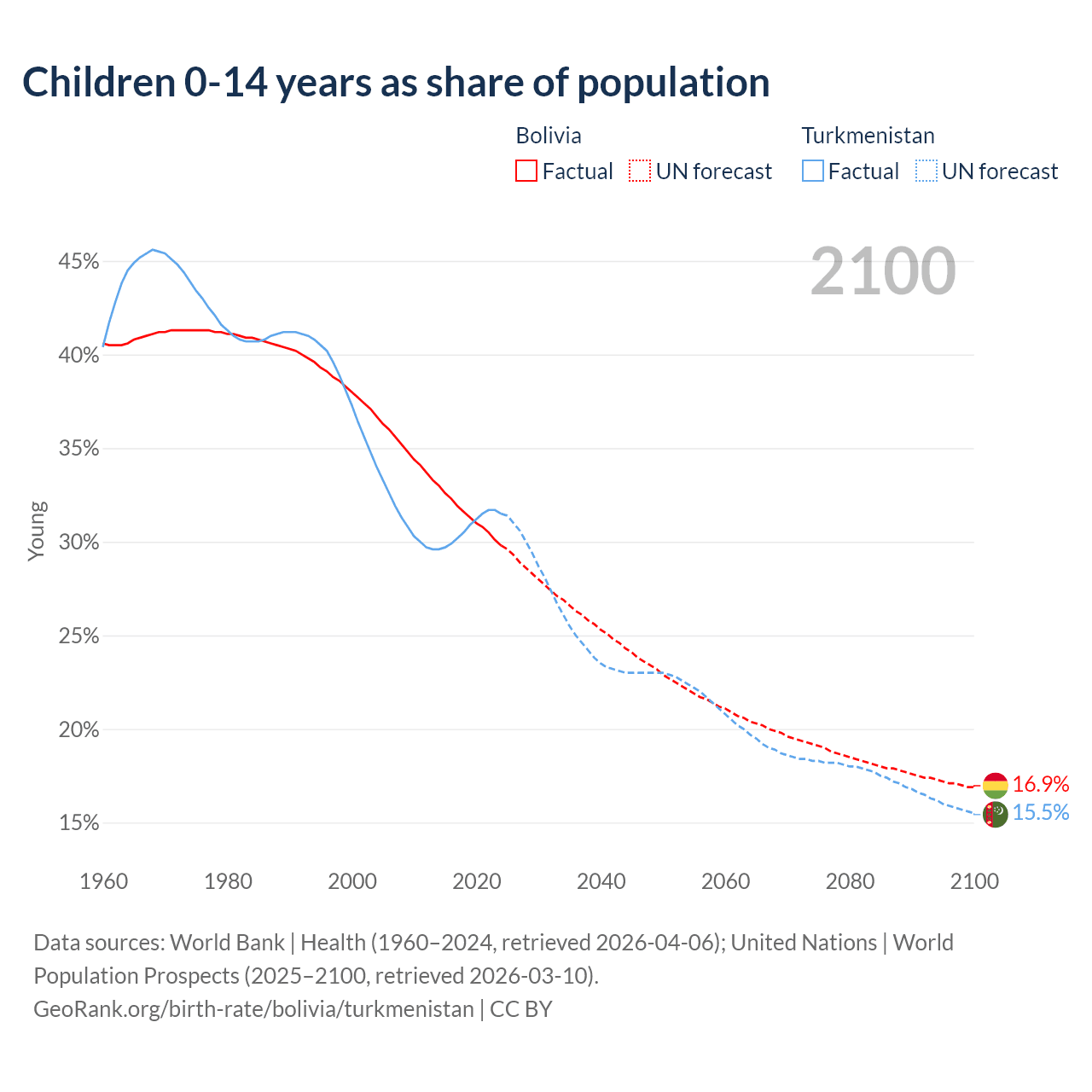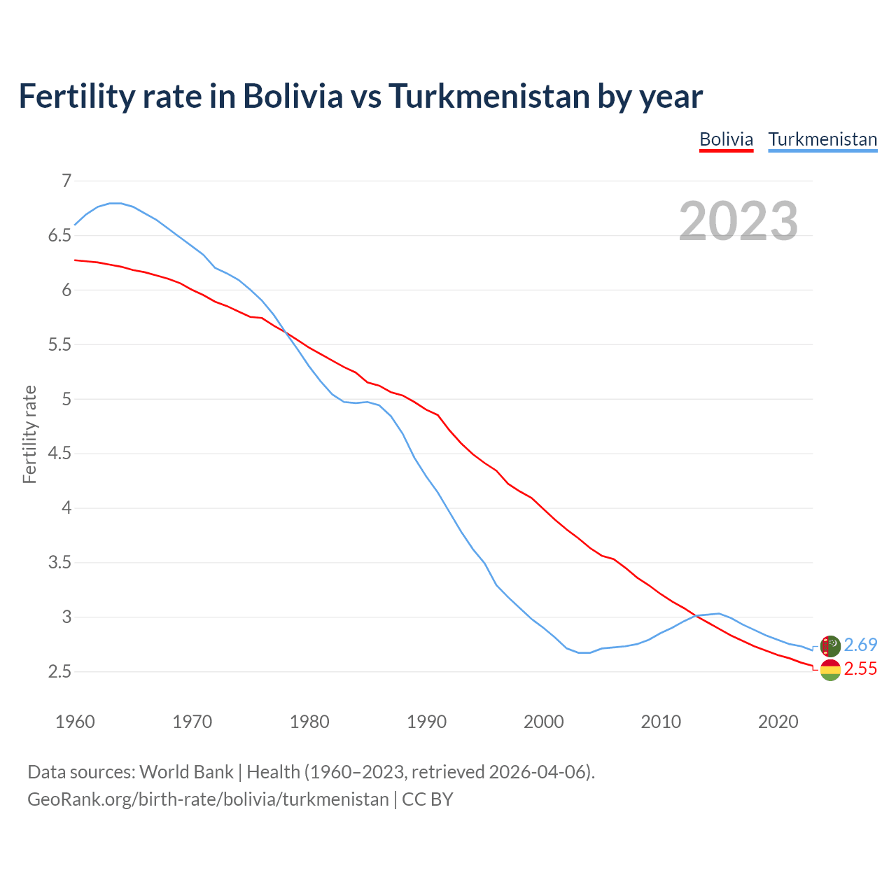 According to the latest available data on birth rates, the fertility rate in Bolivia was 2.55 children per woman in 2023, compared to 2.69 in Turkmenistan in 2023. The replacement level is considered to be 2.1 children per woman.