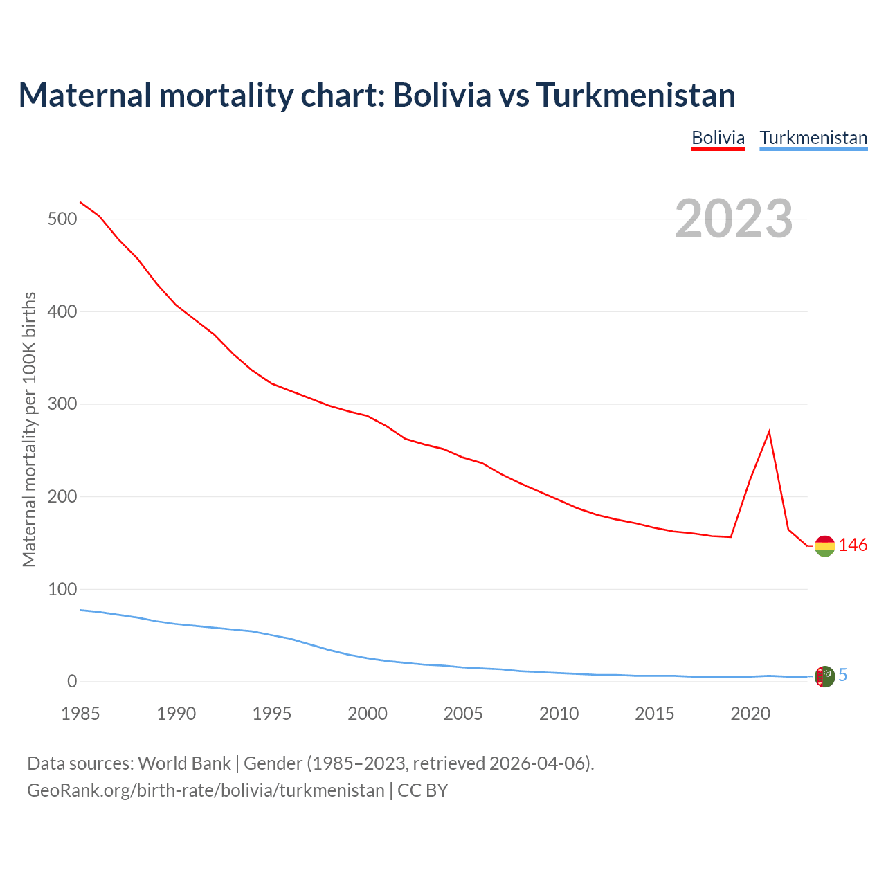 The maternal mortality rate, which is the probability of dying during childbirth or within 42 days of pregnancy termination, is 146 deaths per 100,000 live births in Bolivia, compared to 5 deaths in Turkmenistan.