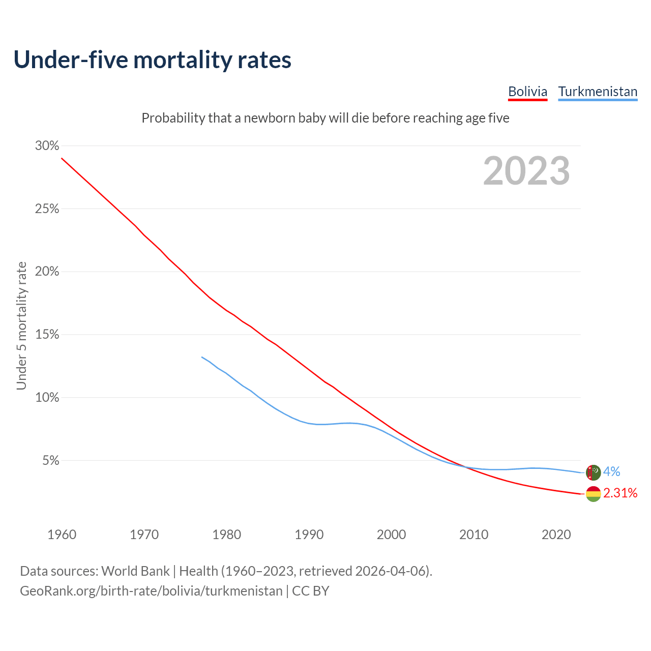 The chance that a newborn baby will die before reaching age five is 2.31% in Bolivia and 4% in Turkmenistan. Above is a chart with historical data on under-five mortality rates.