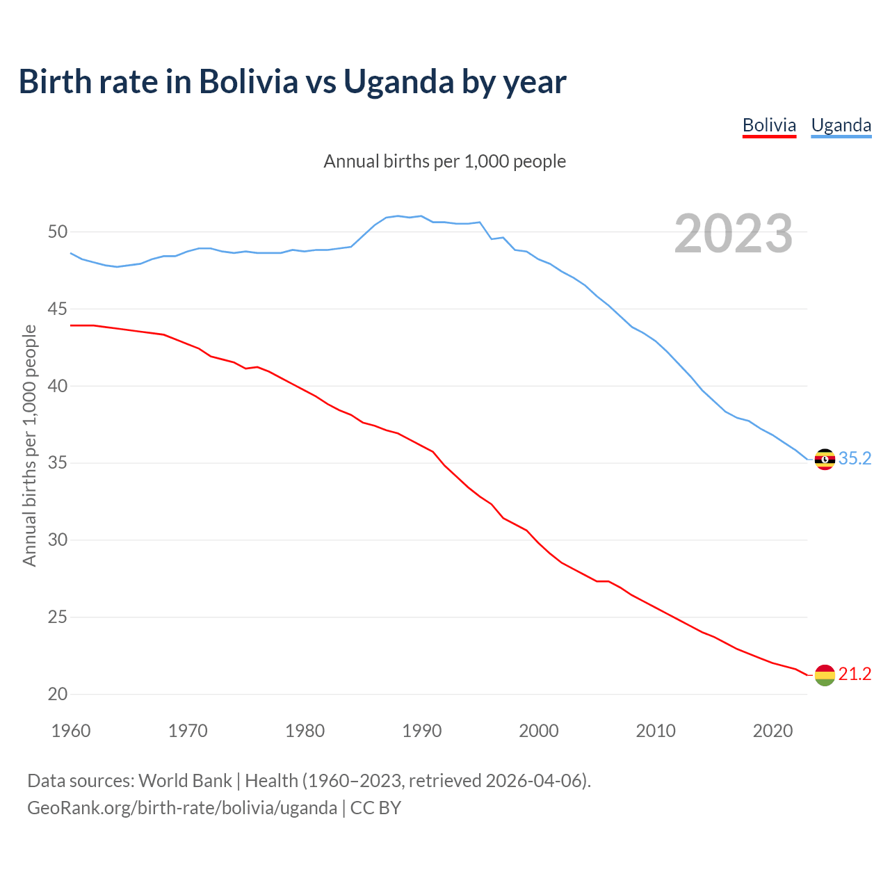 Bolivia has an annual birth rate of 21.2 births per 1,000 people, compared to 35.2 for Uganda. The average number of children a woman is expected to have during her lifetime — the fertility rate, is 2.55 in Bolivia and 4.28 in Uganda — 68.2% difference.