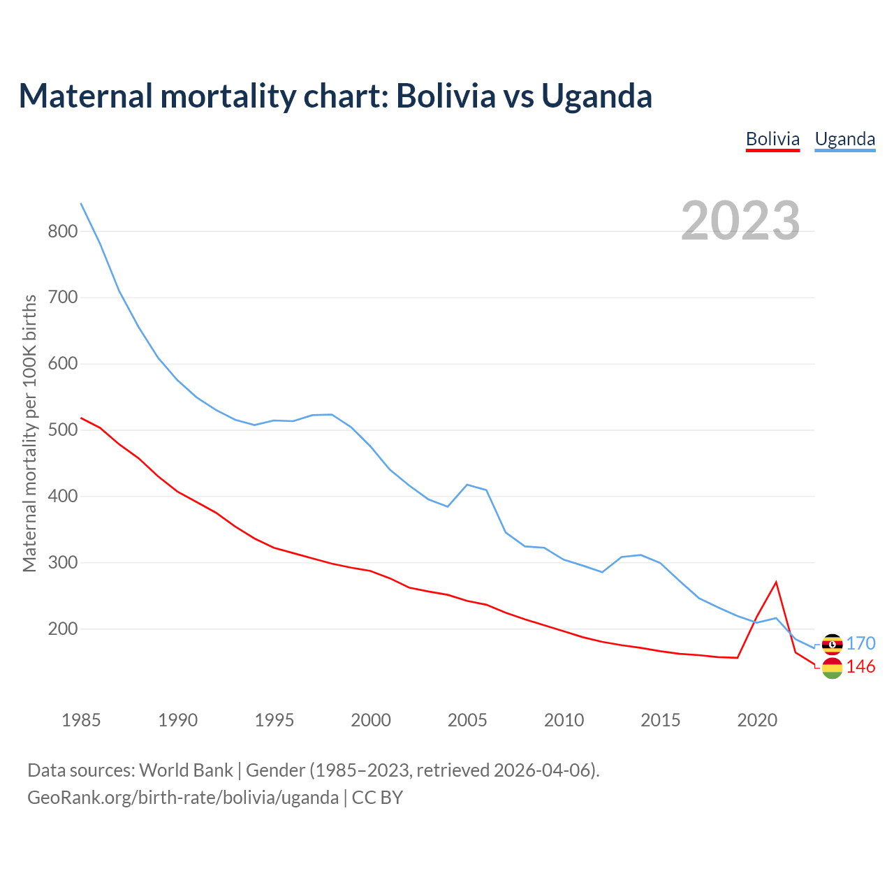 The maternal mortality rate, which is the probability of dying during childbirth or within 42 days of pregnancy termination, is 146 deaths per 100,000 live births in Bolivia, compared to 170 deaths in Uganda.