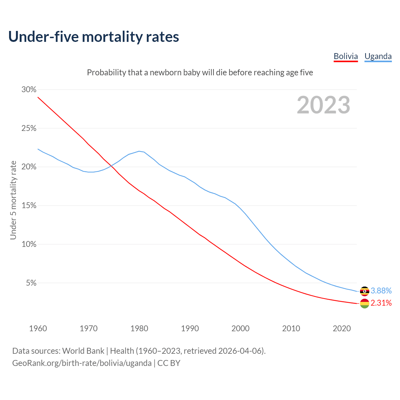 The chance that a newborn baby will die before reaching age five is 2.31% in Bolivia and 3.88% in Uganda. Above is a chart with historical data on under-five mortality rates.