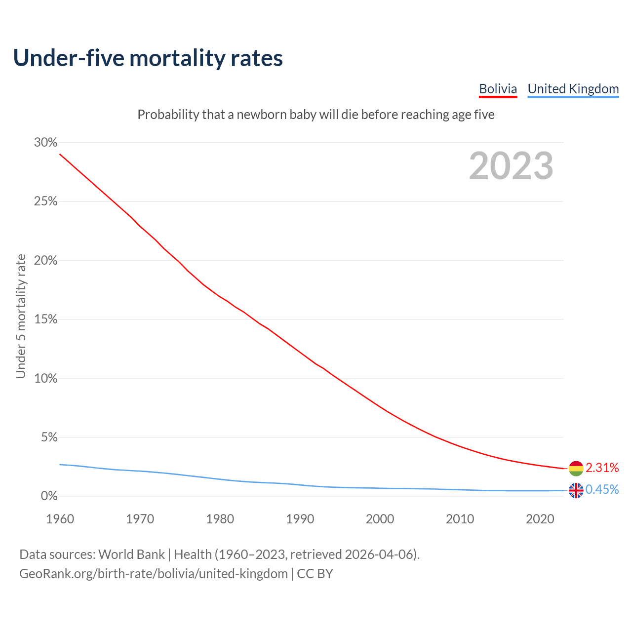 The chance that a newborn baby will die before reaching age five is 2.31% in Bolivia and 0.45% in the United Kingdom. Above is a chart with historical data on under-five mortality rates.